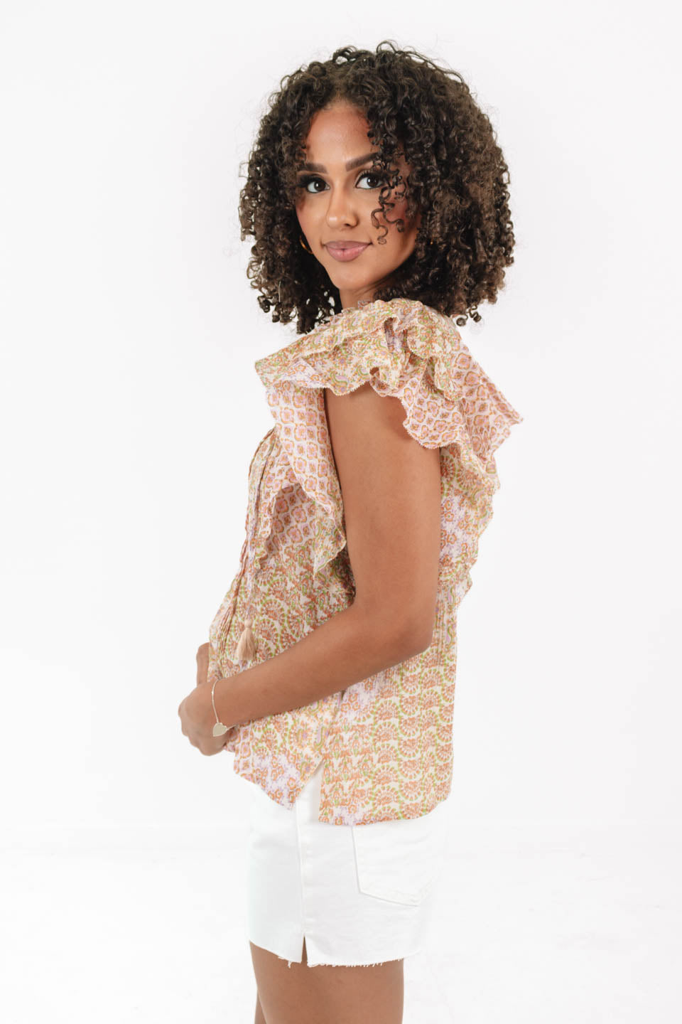 This top is soft, sweet, and full of vintage charm — like a sunset stroll in blouse form. With layered ruffles and a delicate tie neckline, it’s giving effortless romance with just a hint of boho flair. Perfect for days when you want to look like you planned your outfit, even if you didn’t!