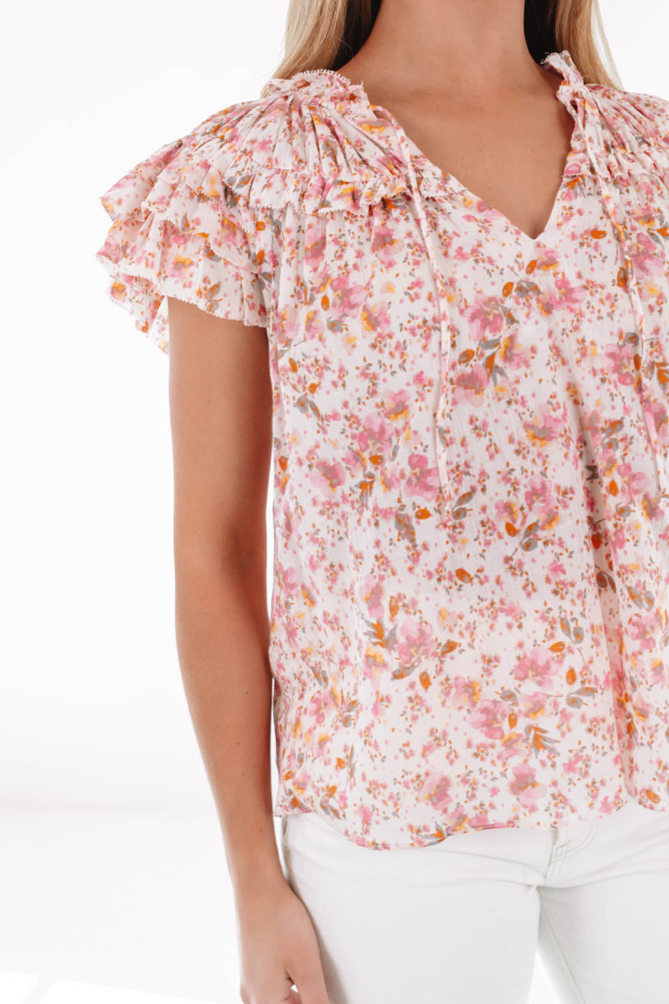 This flirty floral top is like a breath of fresh spring air, with its soft pastel blooms and playful ruffled sleeves! The delicate smocked details and tie neckline add just the right amount of vintage romance. Perfect for brunch dates or sunny strolls, this top is made for twirling through the season in effortless style!