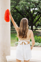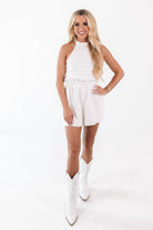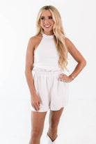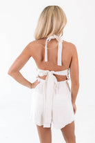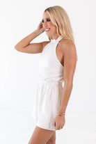 Channel summer vibes with this simple white halter top romper! Featuring a classic white material with an open back, this sleeveless beauty is perfect for sunny adventures and outdoor picnics. Pair it with your favorite shades and a refreshing drink to complete the ultimate carefree look.
