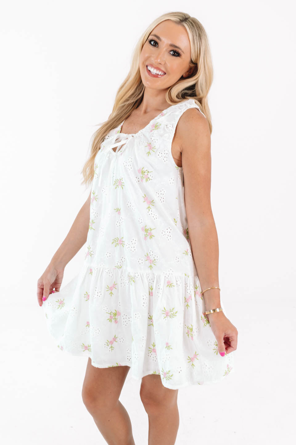 This sweet little eyelet dress is giving major garden party energy with its delicate floral embroidery and flirty bow-tie neckline! Light, airy, and oh-so-twirly, it’s made for sunshine-filled days and spontaneous picnics. Just add a smile and sandals, and you’re effortlessly adorable!