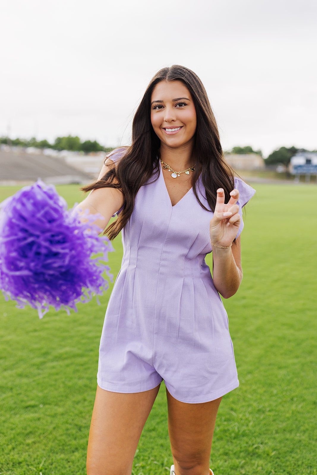 This lilac romper is your flirty-fun answer to looking cute with zero effort. With statement ruffle sleeves and a flattering V-neckline, it’s basically sunshine in outfit form. Perfect for brunch, gameday, or just being the best-dressed wherever you go!