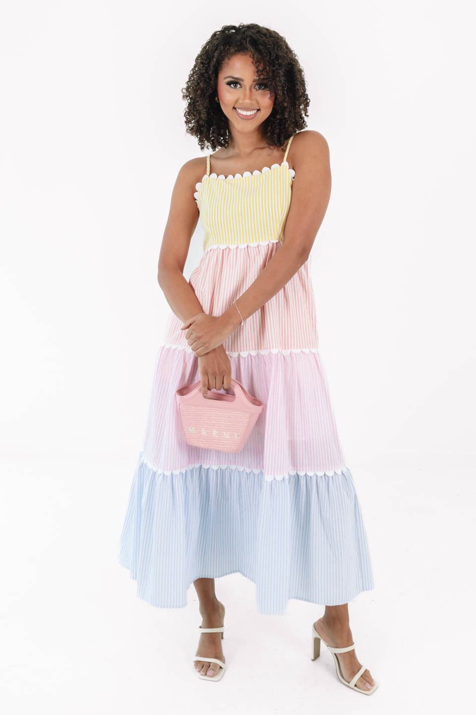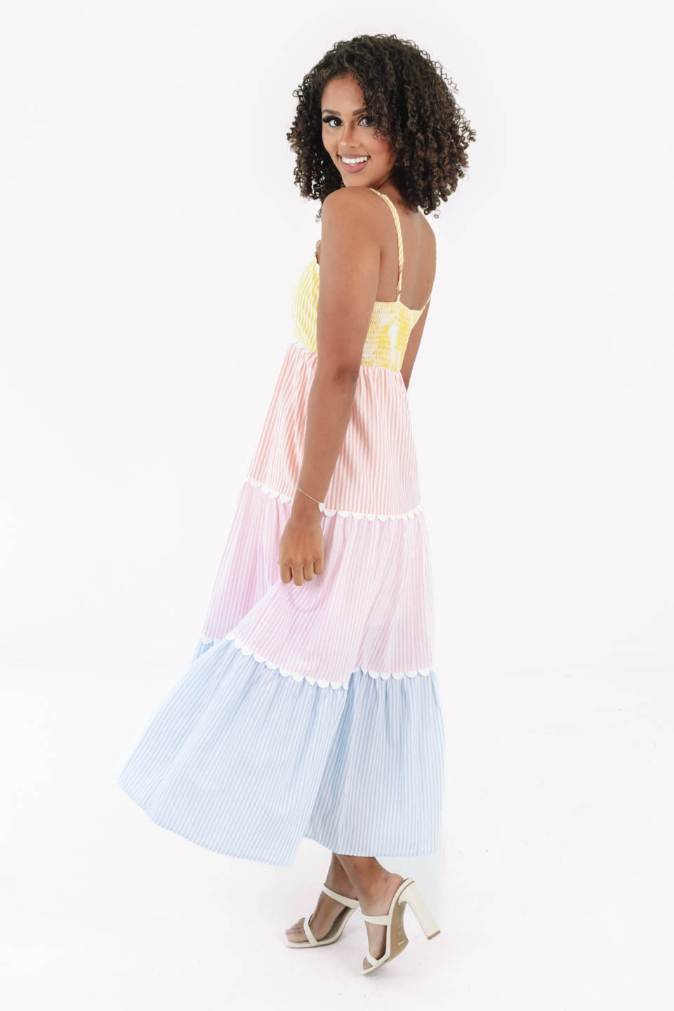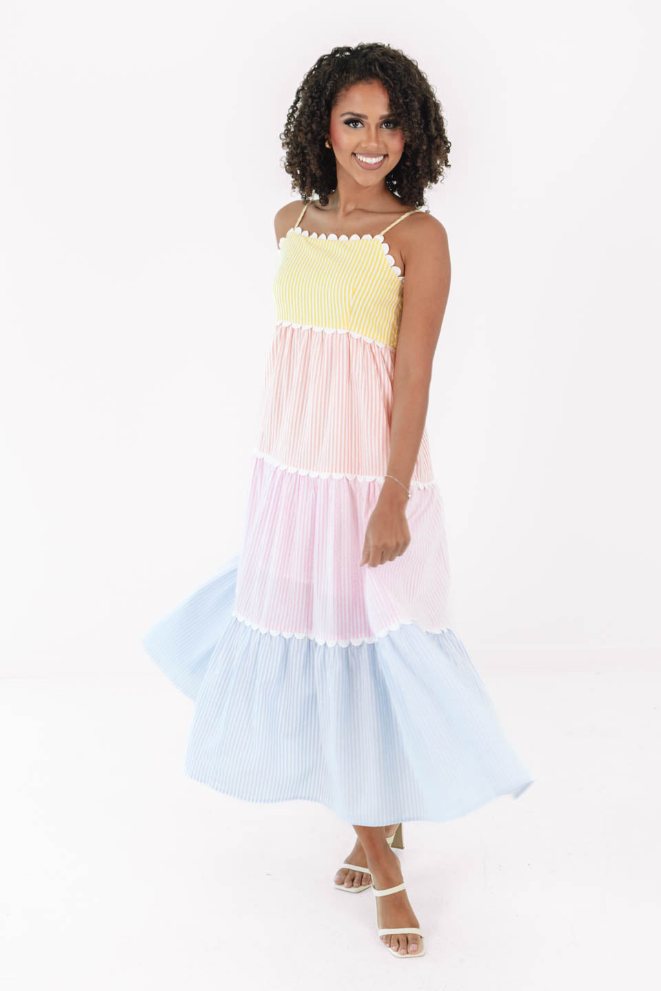 This pastel tiered sundress is pure summer joy with its playful stripes and scalloped trim — like a rainbow sherbet dream come true! Pair it with a straw hat and some dainty gold jewelry for the perfect picnic-in-the-park or beach boardwalk stroll. Just add sunshine and your favorite sunglasses to complete the look!