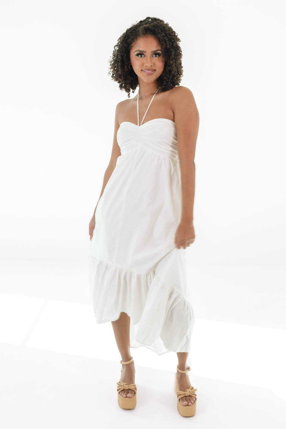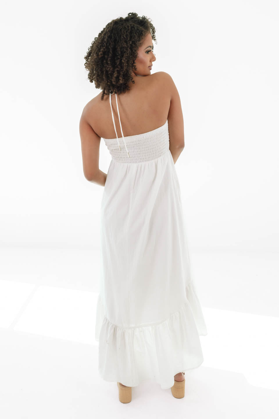 Breezy, beautiful, and effortlessly elegant—this white halter dress is a must-have for sunny days and starry nights! With a ruched bodice, flowy tiered skirt, and a flirty open back, it’s the perfect mix of casual charm and chic sophistication. Whether you're strolling along the beach or dancing the night away, this dreamy dress is pure summertime magic!