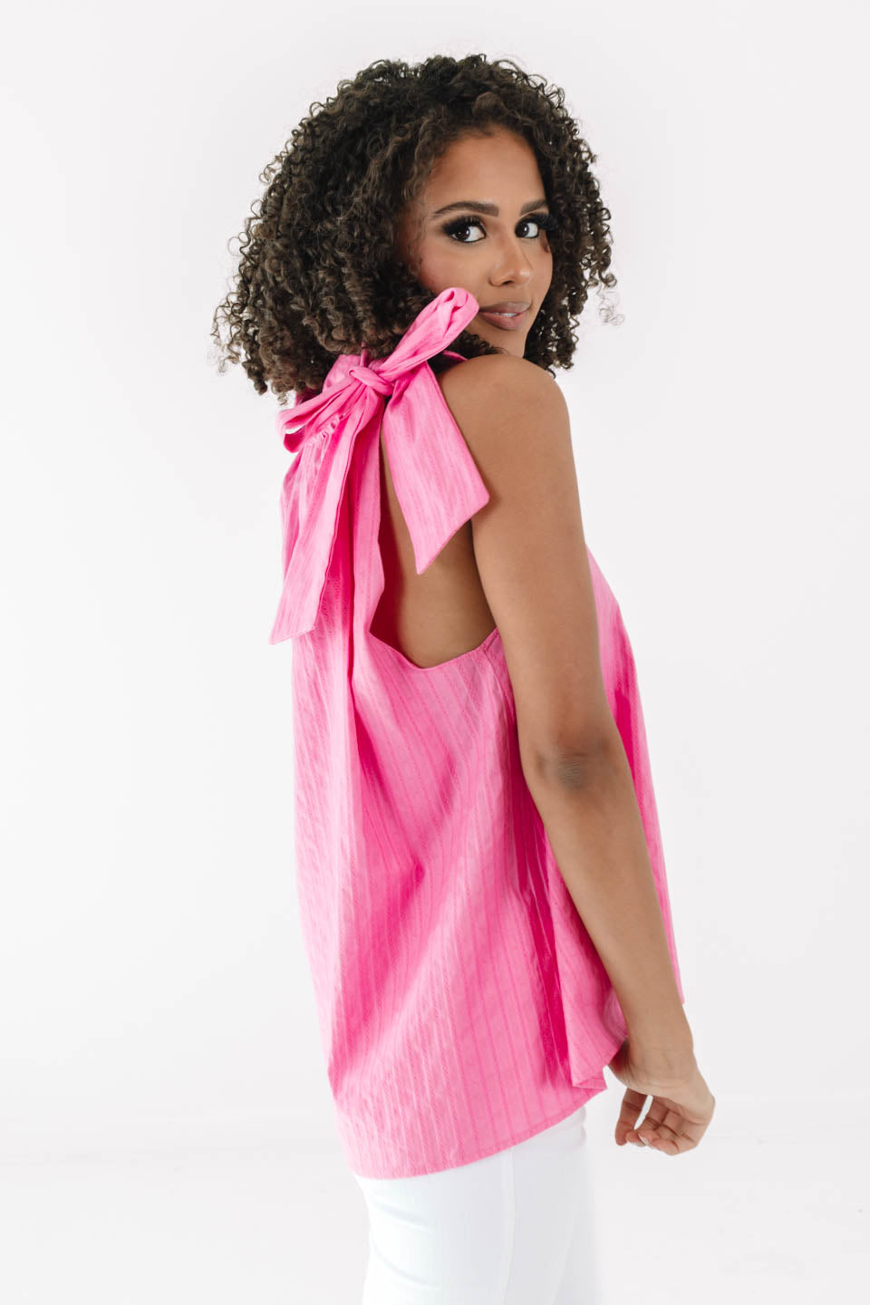 This flirty pink top is giving all the summer vibes with its flowy fit and playful shoulder tie. The subtle textured stripes add just the right touch of detail to keep things interesting. Pair it with white jeans and you're ready for brunch, a beach stroll, or just feeling fabulous!