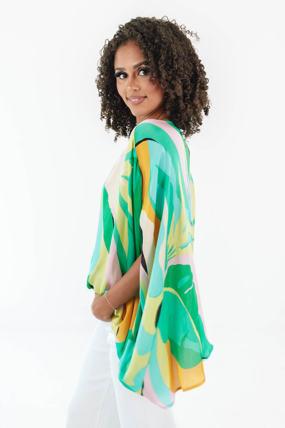 This bold and breezy top brings serious island vibes with its swirl of tropical colors and effortless drape. The flowy fit and open sleeves add just the right amount of drama for a look that's playful yet polished. It’s the ultimate statement piece for turning any day into a sunshine-filled adventure!