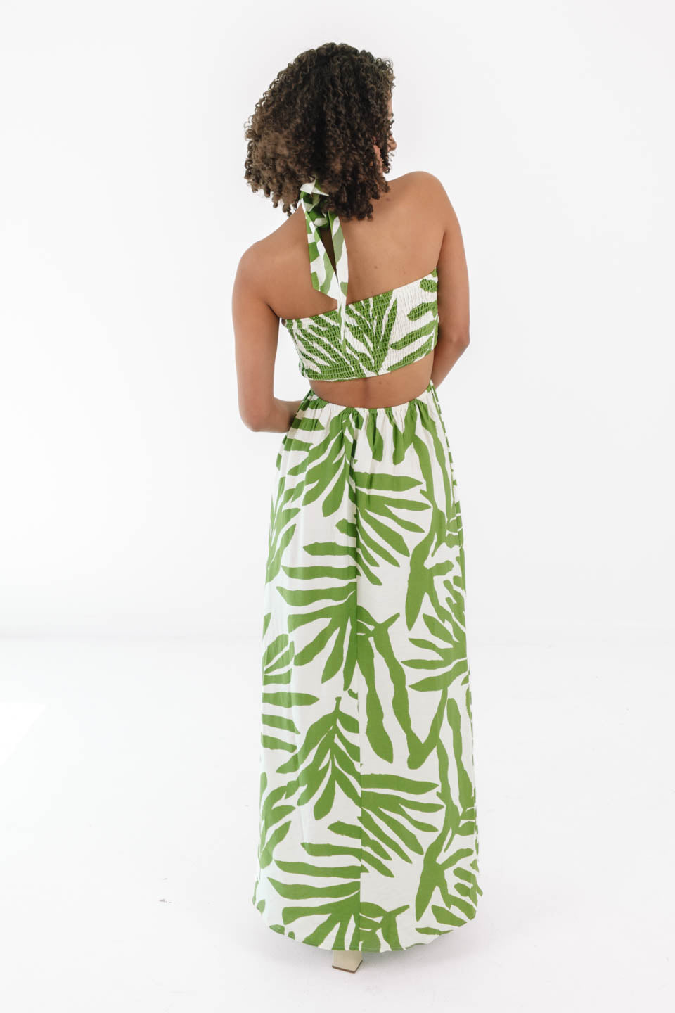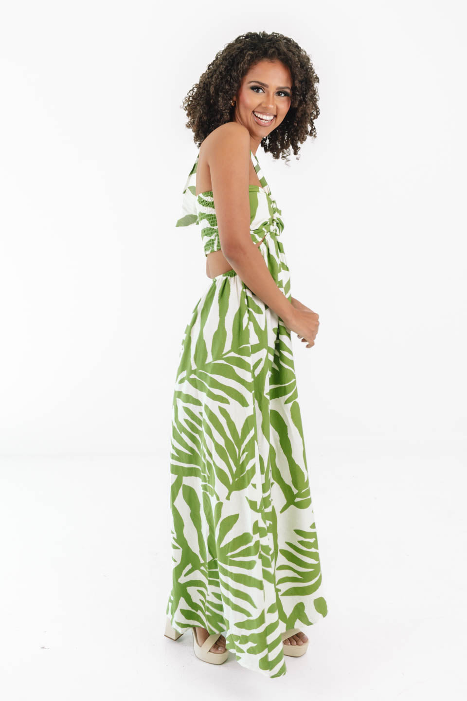 This tropical dream dress is giving vacay vibes only with its bold green leaf print and breezy cutouts. The halter neckline and flowy silhouette are made for sipping something fruity under the sun. It's your ultimate “pack me now” piece for beach getaways and summer soirées!