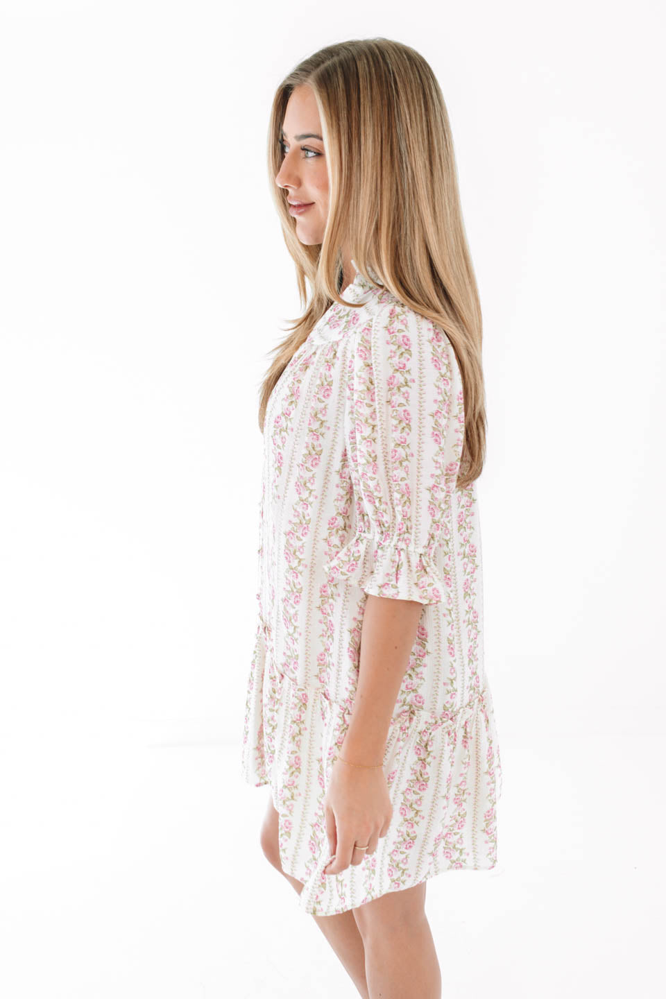 Sweet with a touch of vintage charm, this floral dress is made for effortless days. The soft striped pattern, flutter sleeves, and ruffled neckline add just the right amount of feminine flair. Easy to dress up with wedges or keep casual with sandals, it’s a go-to for brunch dates and sunny strolls alike.