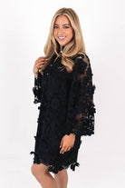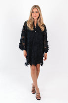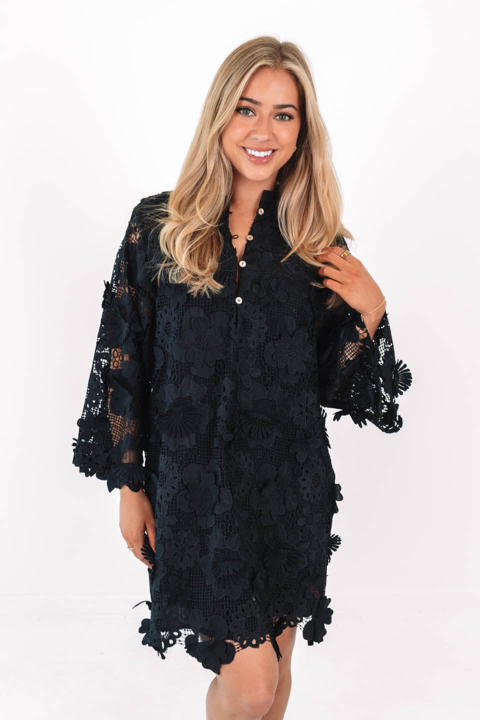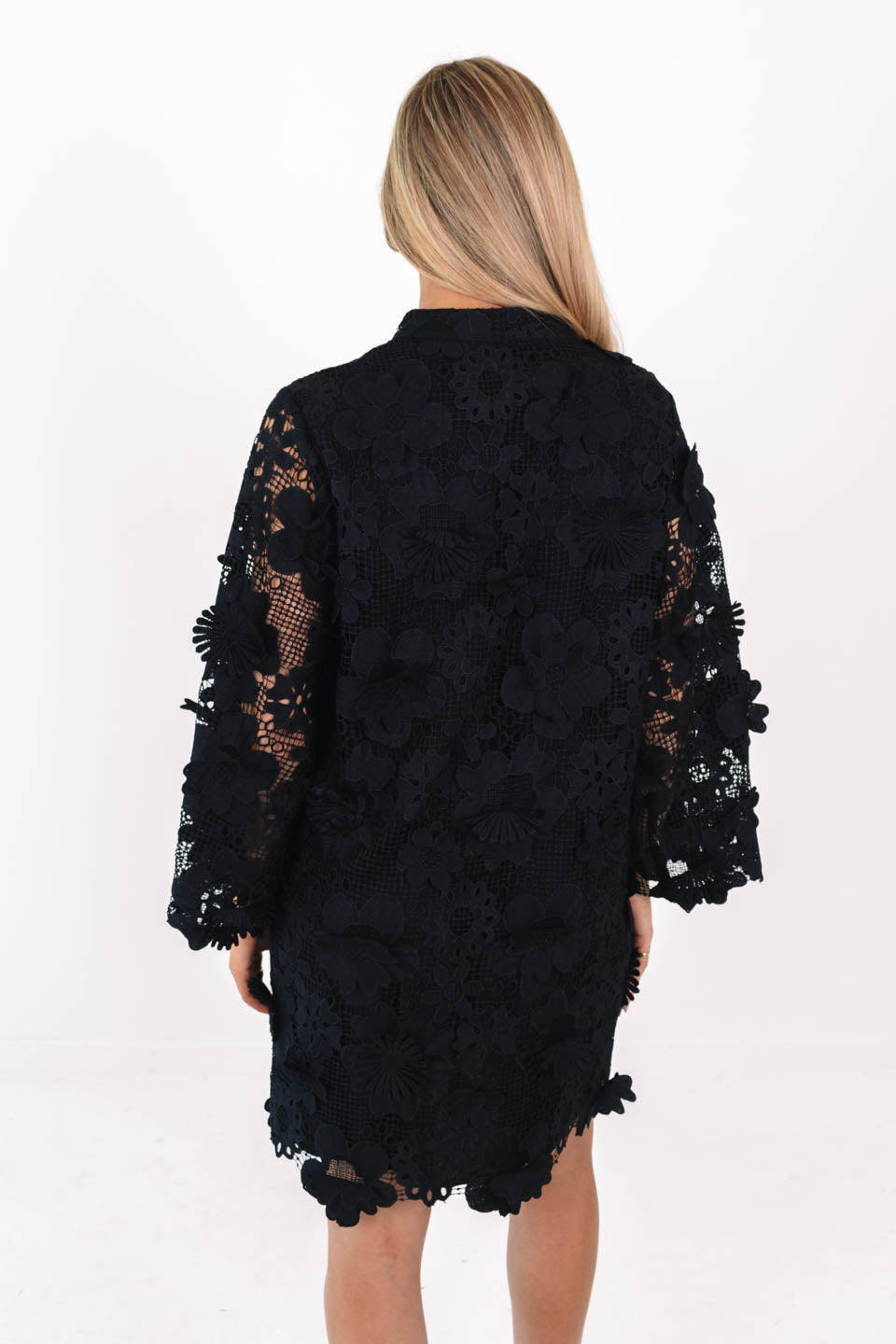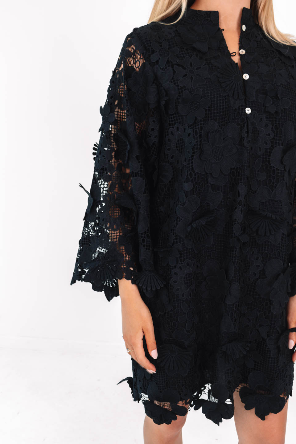 Turn heads with this enchanting black caftan lace dress that combines timeless elegance with a playful edge. The delicate lace and front buttons add a touch of vintage charm, while the above-the-knee length keeps it flirty and fun. Perfect for a garden party or a night out, this dress will make you feel like a modern-day princess!