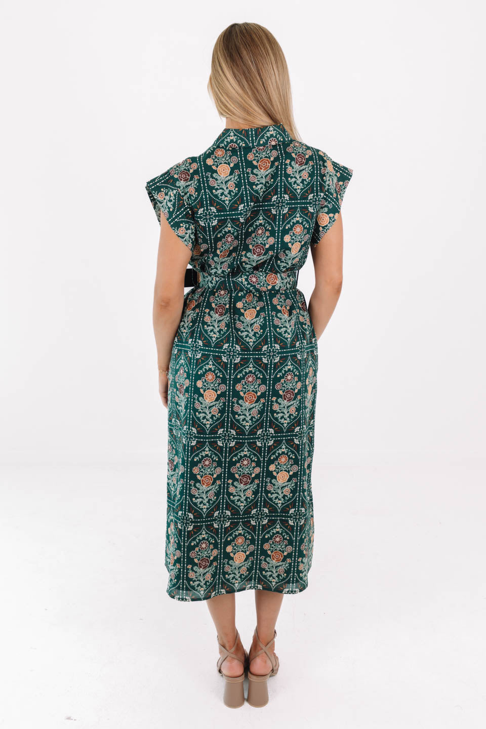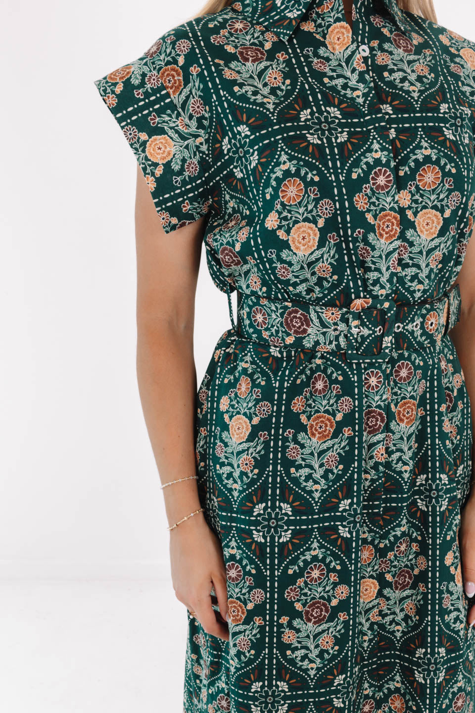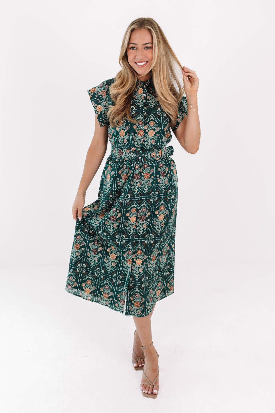 The Hazel Belted Button Up Midi Dress - Hunter Green
