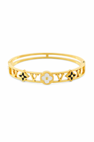 Bold, chic, and full of designer-inspired flair — this gold bangle is a true statement piece. The sleek cutout details paired with contrasting clover motifs give it a luxe, fashion-forward edge. Wear it solo for standout shine or stack it up for a glam, layered look.