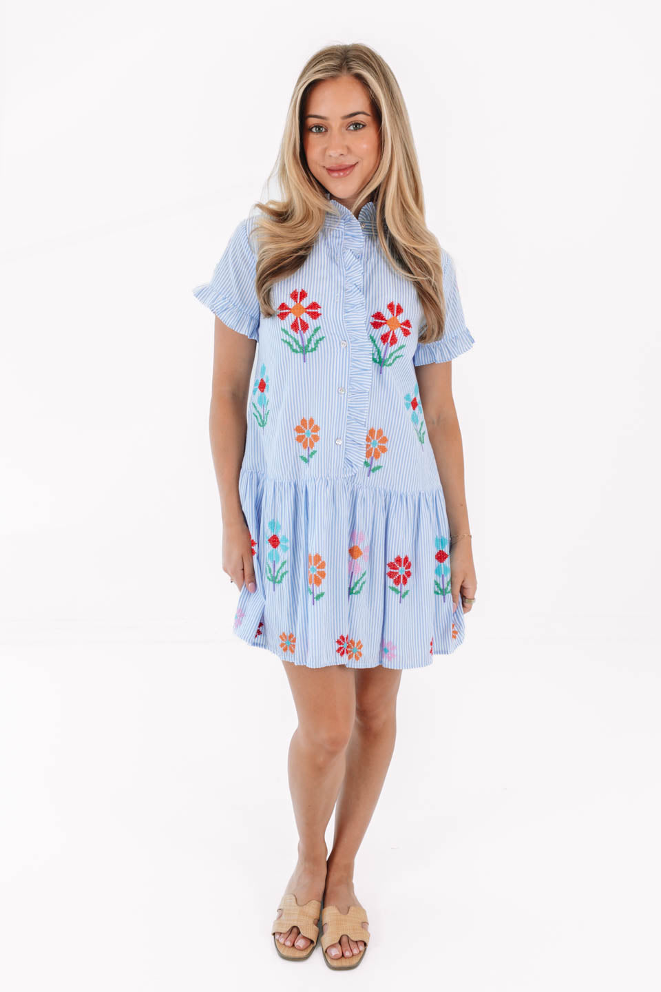 The Calypso Ruffle Button Up Dress - Blue Stripe