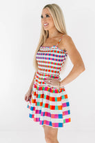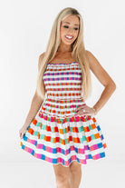 This playful mini dress is a burst of color with its vibrant checkered print and flirty tiered skirt. The smocked bodice hugs just right while the ruffled details add the sweetest touch of movement. It’s the ultimate throw-on-and-glow piece for sunny days, weekend brunches, and every twirl in between.