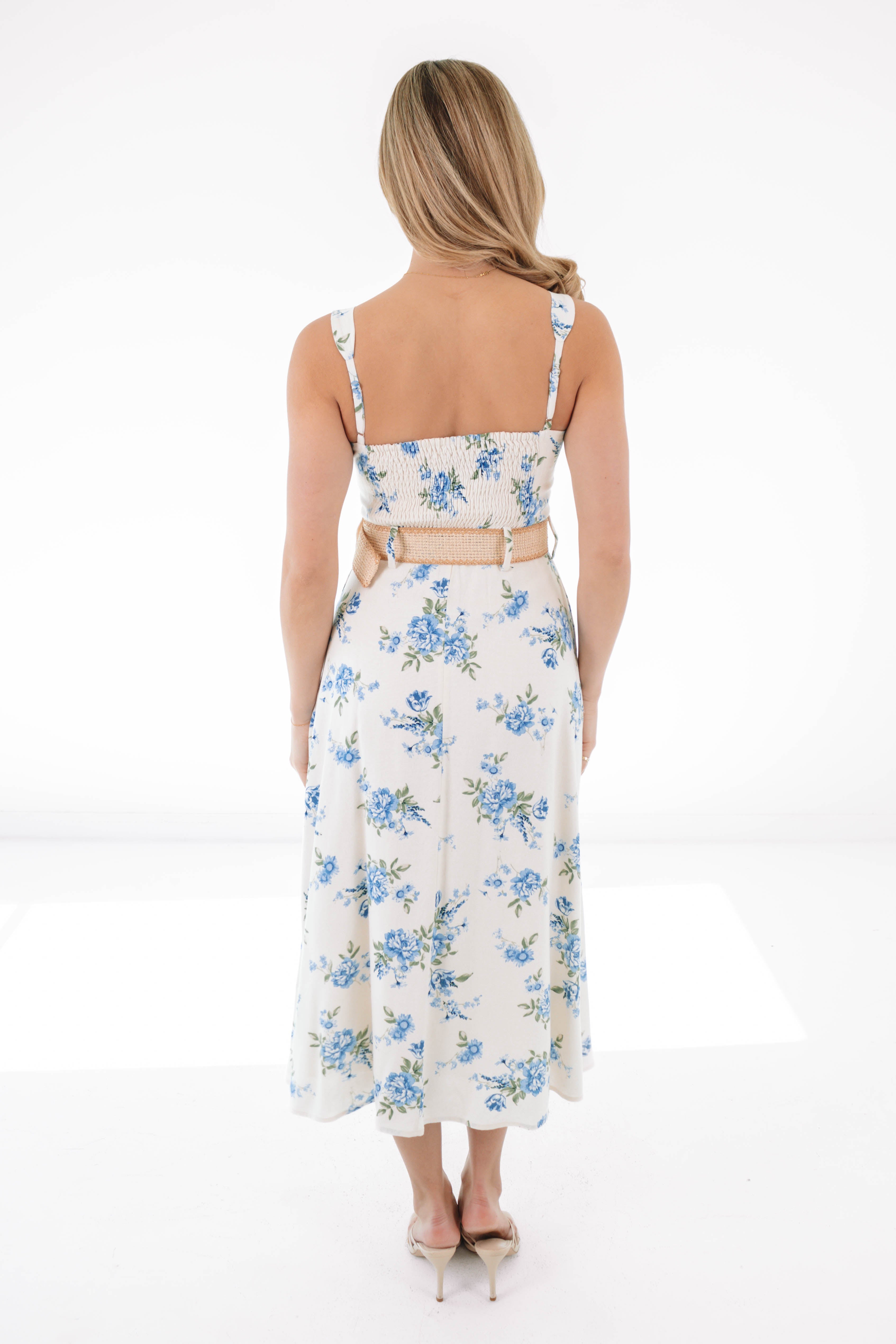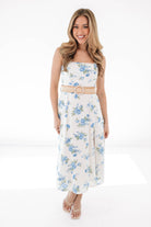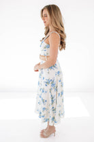 This breezy floral midi is giving effortless romance with a flirty side slit to steal the show. The soft cream base and blue blooms make it perfect for sunny strolls and brunch dates. Just add sandals and a smile—this dress does the rest.