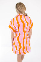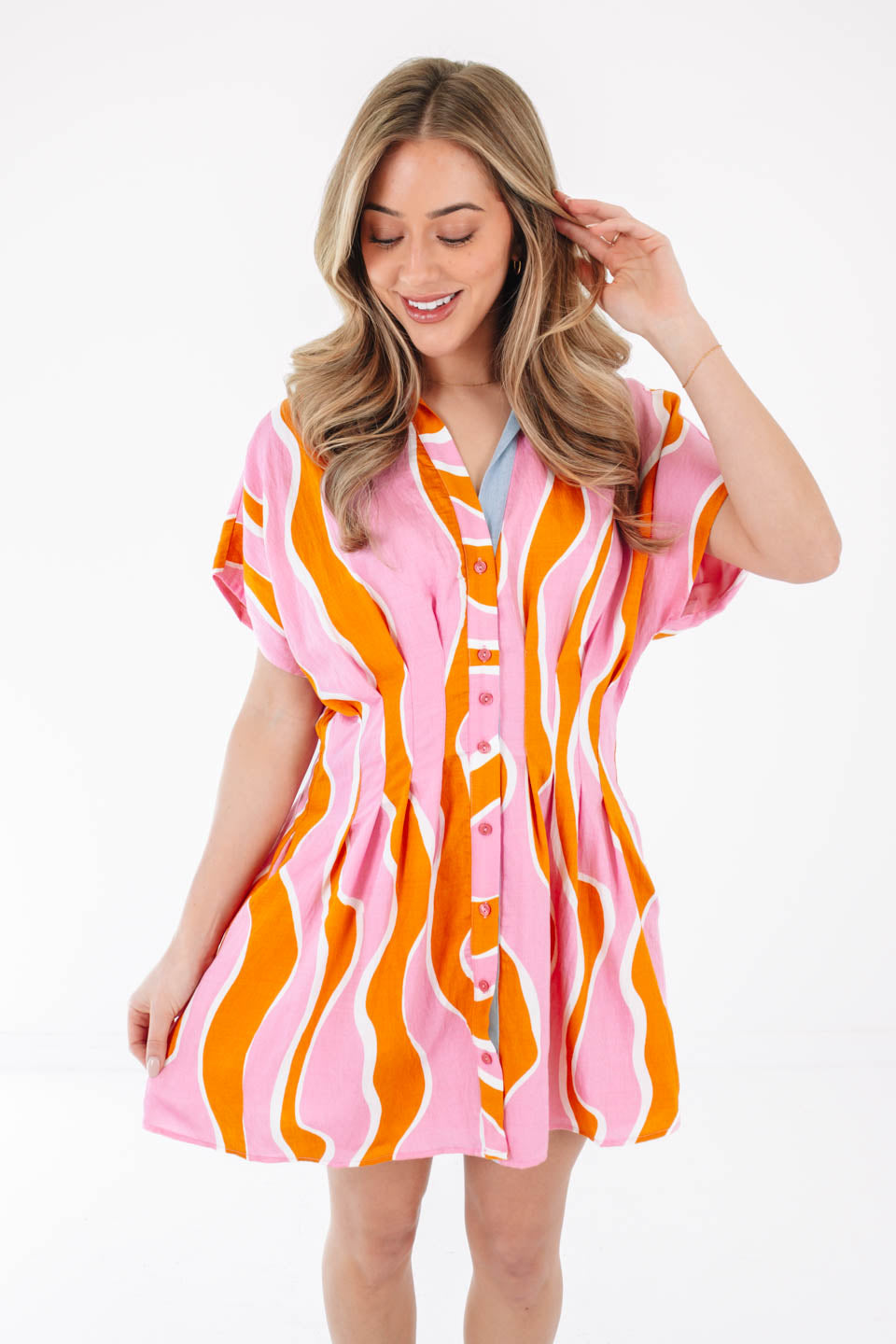 This bold, wavy-print dress brings all the retro vibes with a fresh, modern feel. The relaxed button-front silhouette makes it easy to wear while the pink and orange hues add a pop of sunshine to your look. Perfect for vacations, weekend plans, or anytime you’re in the mood to stand out and have fun.