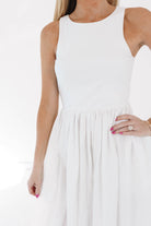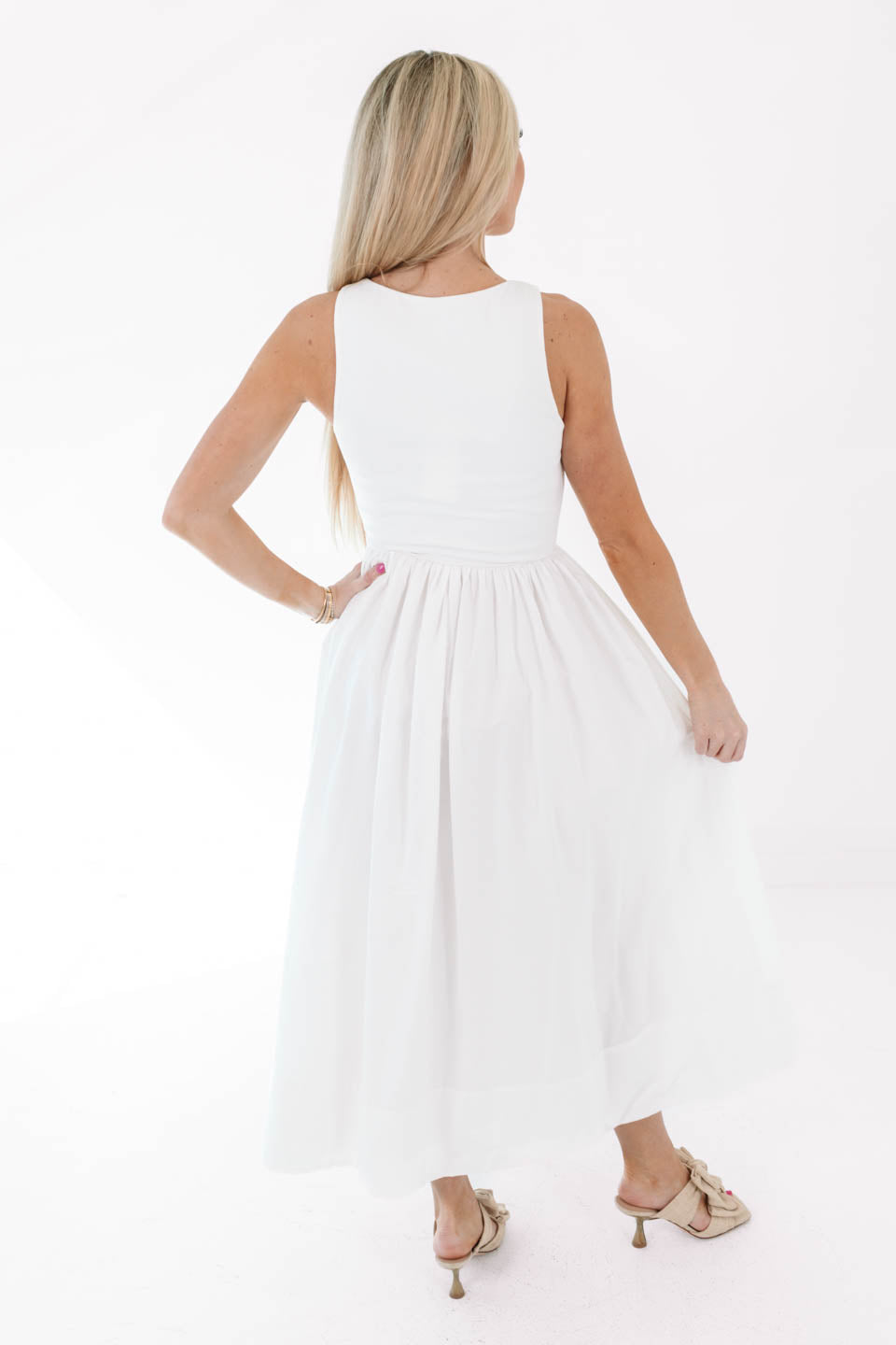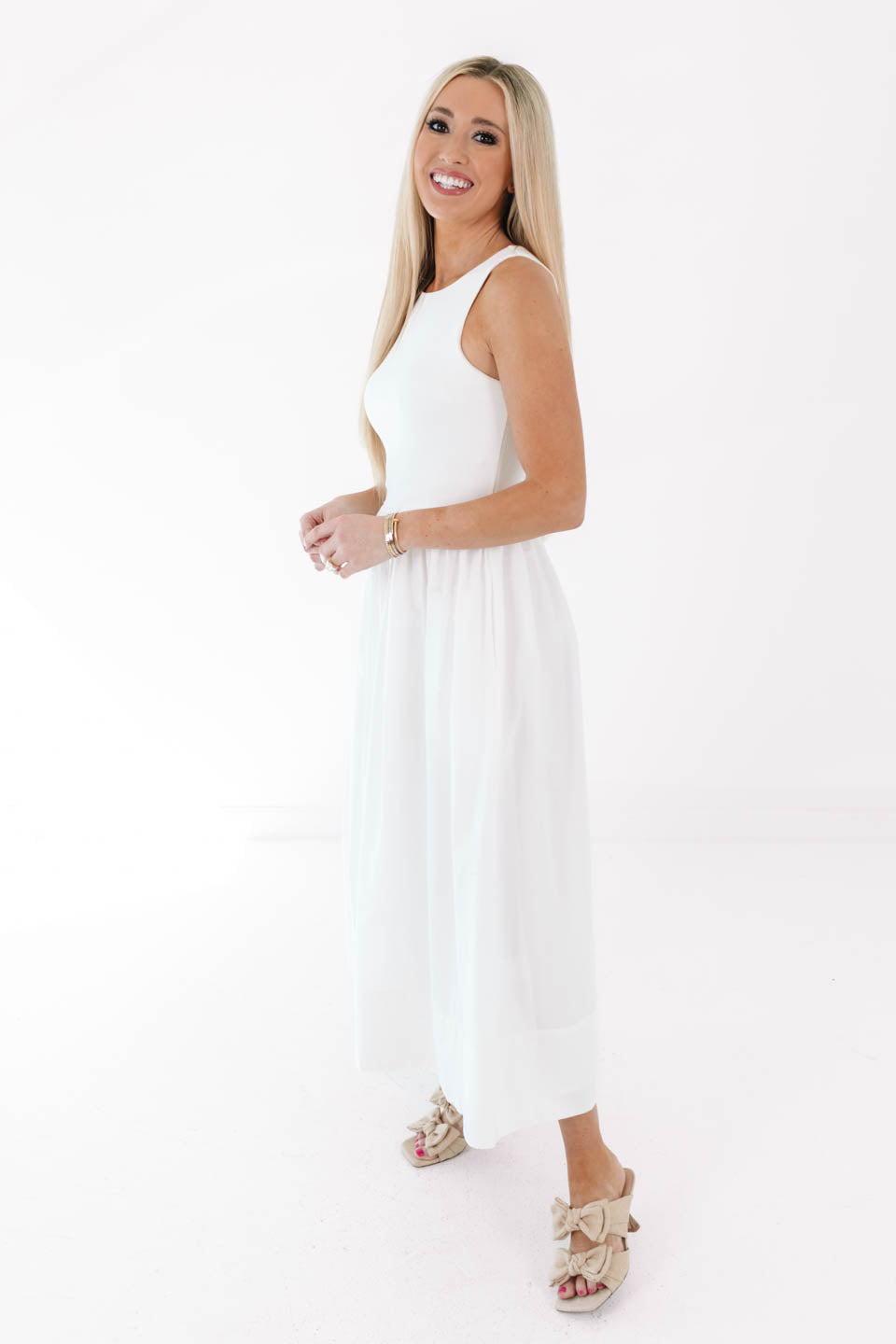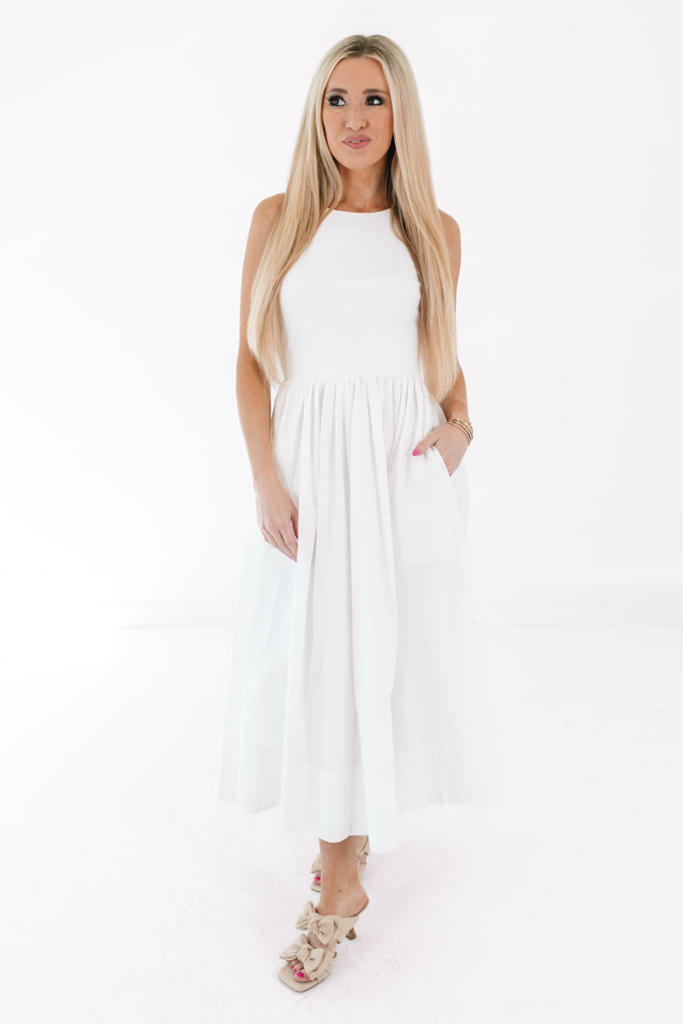 This sleek white midi dress is effortlessly elegant with its fitted bodice and flowy skirt that moves with ease. The high neckline keeps it chic and polished, while the simple silhouette makes it endlessly versatile. Dress it up with statement heels or keep it minimal for a timeless, sophisticated look!