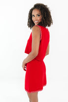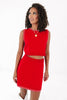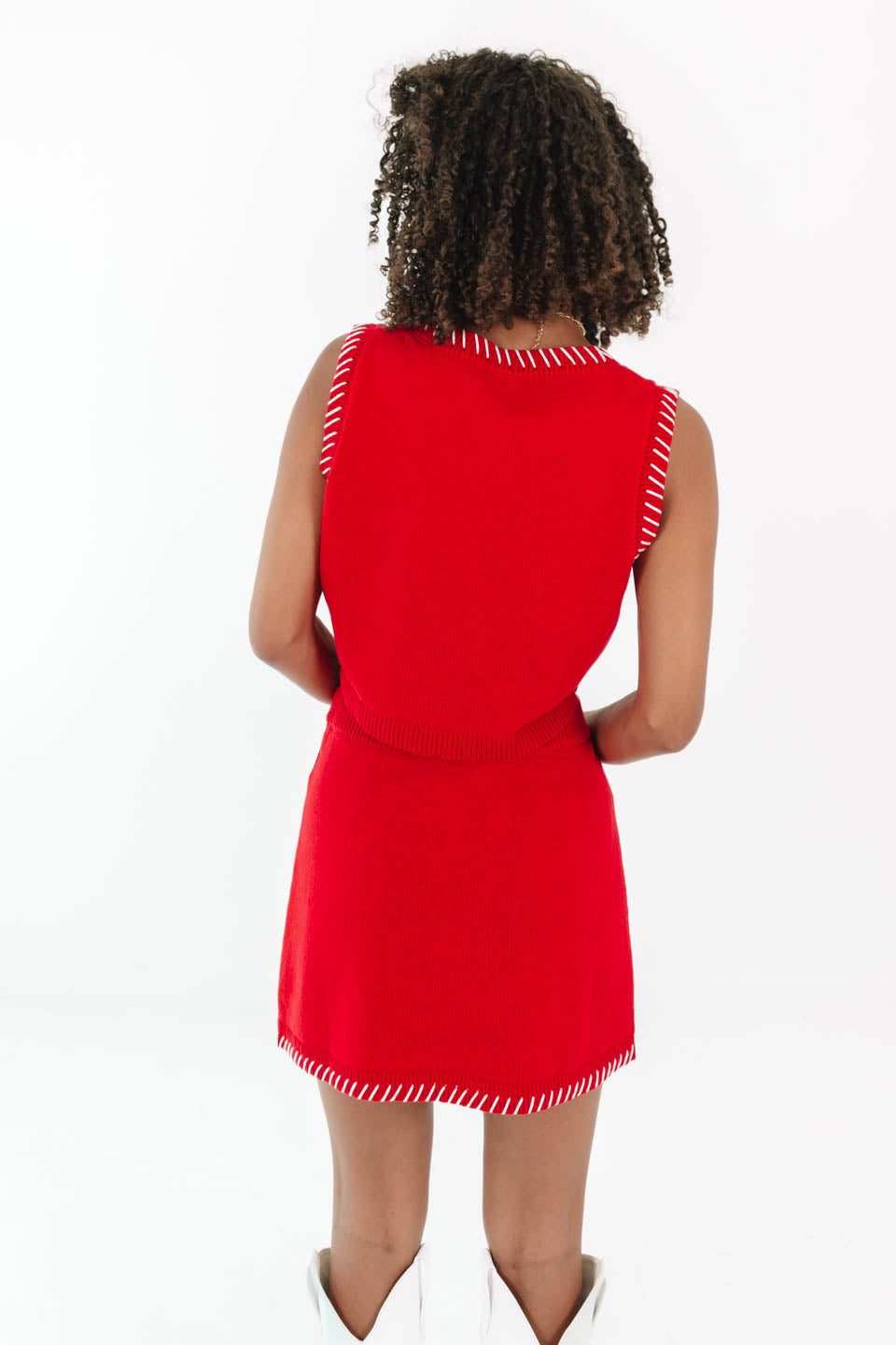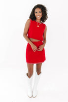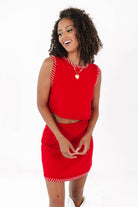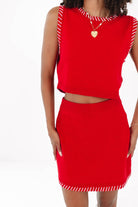 This red knit crop top is serving varsity vibes with a flirty twist, thanks to its contrast stripe trim and bold, head-turning color. It’s the perfect mix of cozy and cute—ideal for chilly game days or casual campus strolls. Rock it with the matching skirt or mix it up with denim for a spirited look that scores every time!