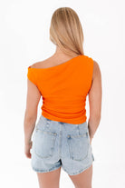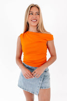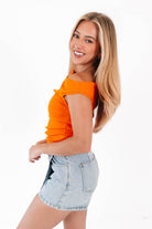 Show off your team spirit with a twist in this bold orange one-shoulder top made for the ultimate gameday glam. The asymmetric neckline brings the drama while the sleek fit keeps it effortlessly cool. Pair it with a pleated skirt or denim for a look that screams school pride with style!