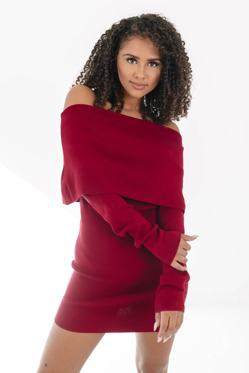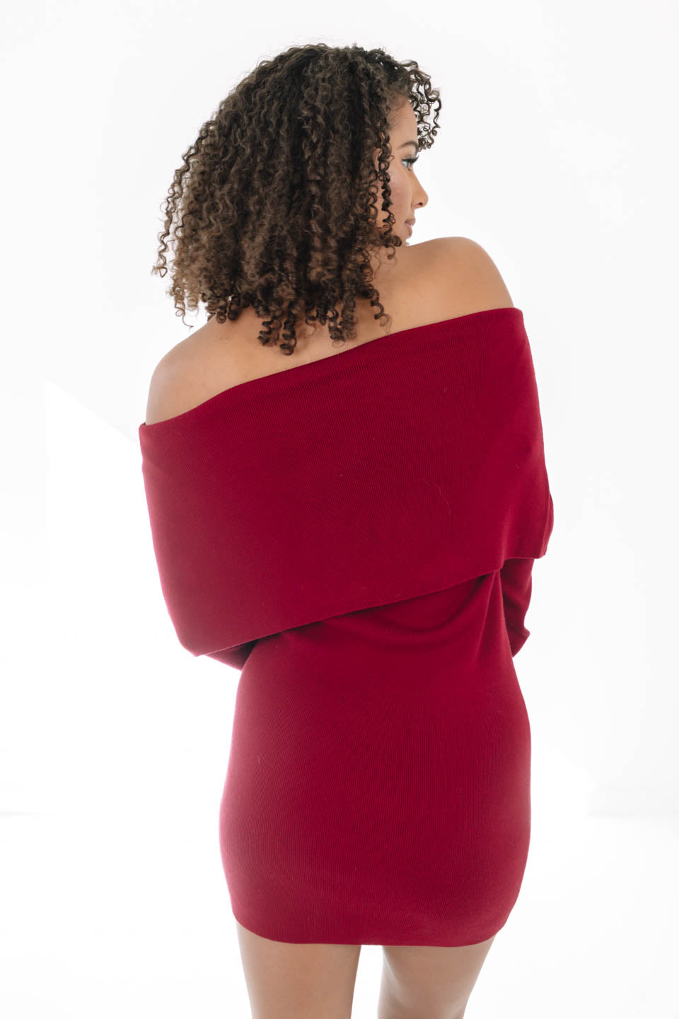 This sleek burgundy sweater dress is the ultimate blend of sass and sophistication, hugging you in all the right places while keeping things cozy. The off-the-shoulder fold-over detail gives it a flirty edge, perfect for turning heads at any winter gathering. Dress it up with heels or keep it casual with boots—either way, you're serving effortless glam!