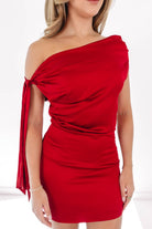 Turn heads in this bold one-shoulder mini dress, featuring a striking bow detail that adds just the right touch of drama. The rich red satin shines with confidence, making it perfect for cocktail parties or holiday soirées. Sleek, chic, and unapologetically glamorous—this dress was made to steal the spotlight!