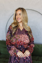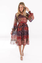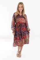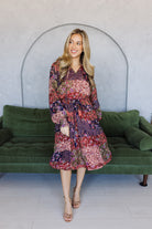 Bohemian charm meets modern style in this fall midi dress! Featuring a flowing silhouette, delicate tie neckline, and an eye-catching patchwork floral print, this dress is perfect for day or night.