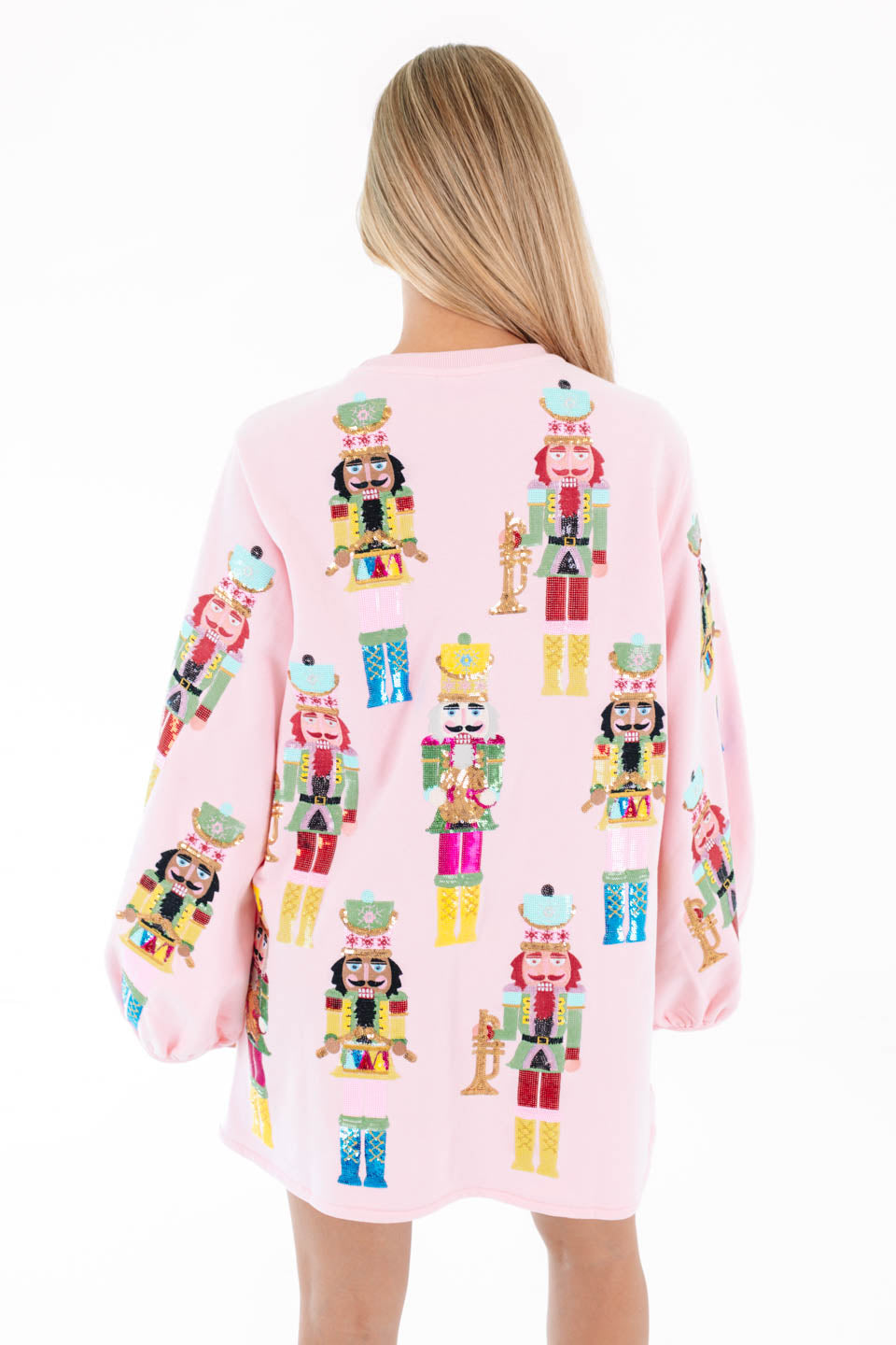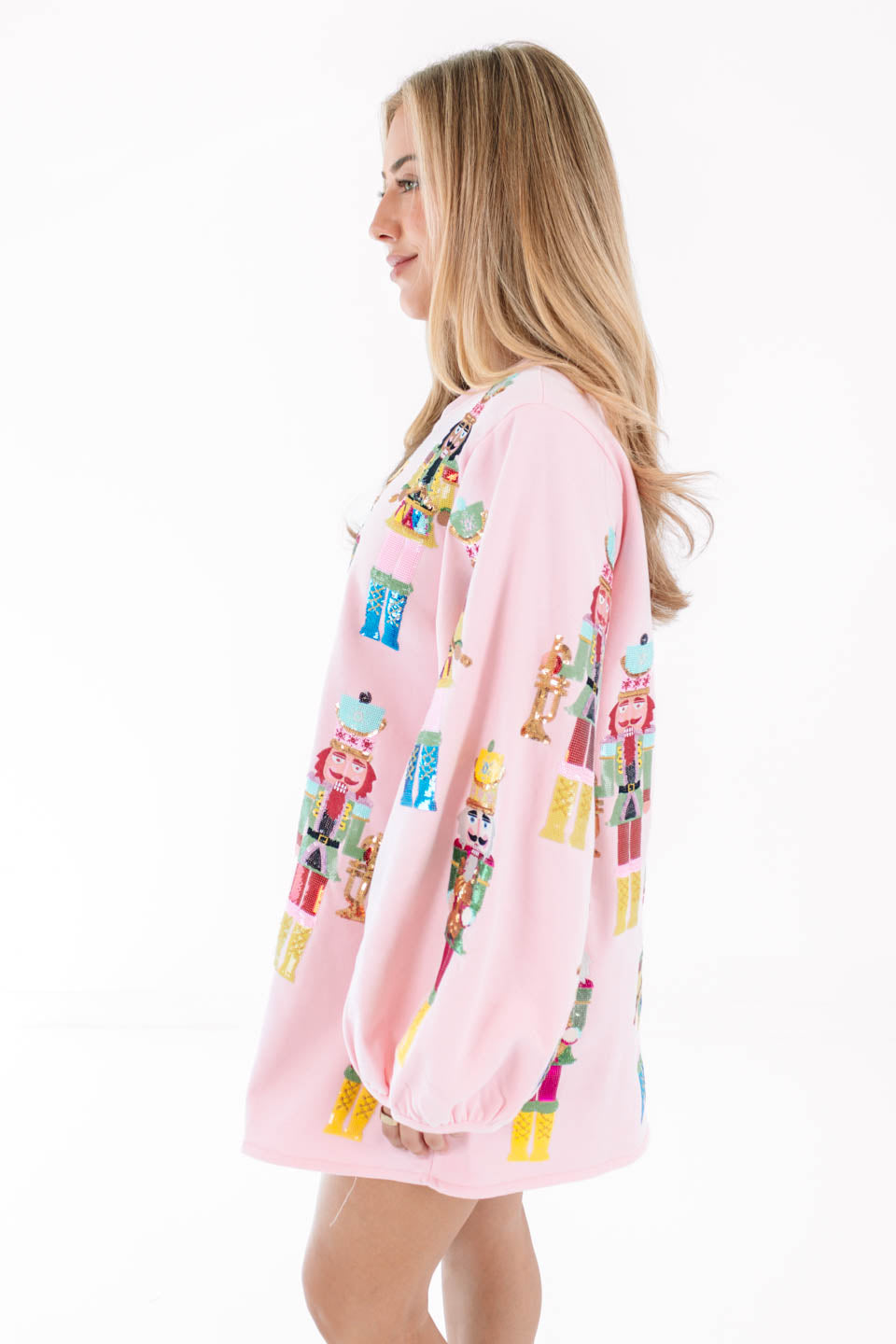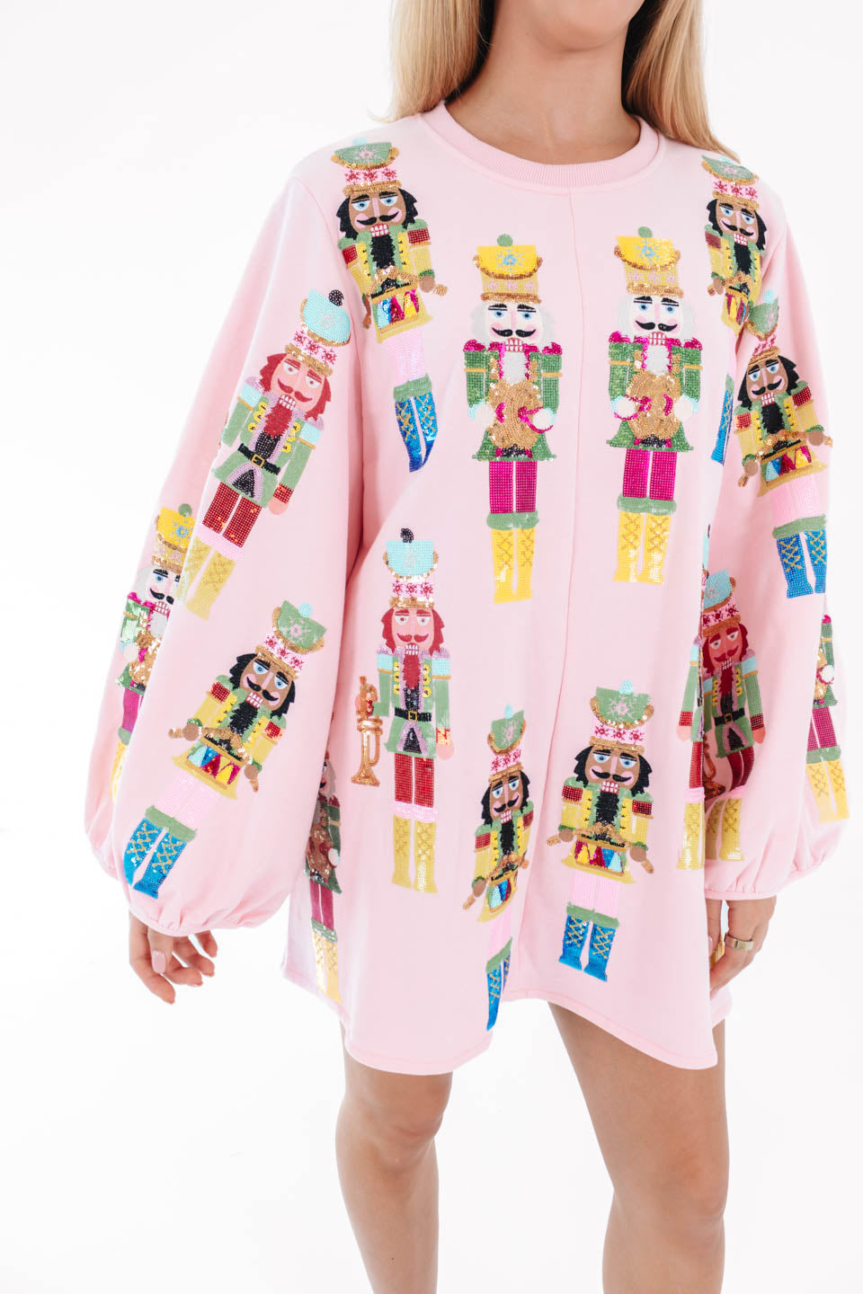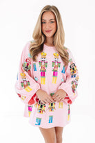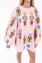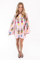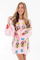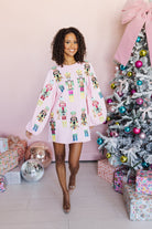 This dress is a festive showstopper covered in bold nutcracker prints that march right into the spotlight! With its playful pink backdrop and balloon sleeves, it brings a perfect mix of whimsy and drama. It’s the ultimate piece to spread holiday cheer while looking fabulously unique!