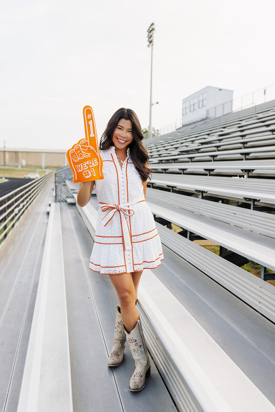 Elevate your game-day style with this gorgeous white and burnt orange dress, featuring intricate eyelet details and crisp white trim. The flattering waist tie and button-down front add a touch of sophistication, making it perfect for cheering in the stands or celebrating afterwards. With its playful ruffles and vibrant hue, this dress is a winning choice for any fan!