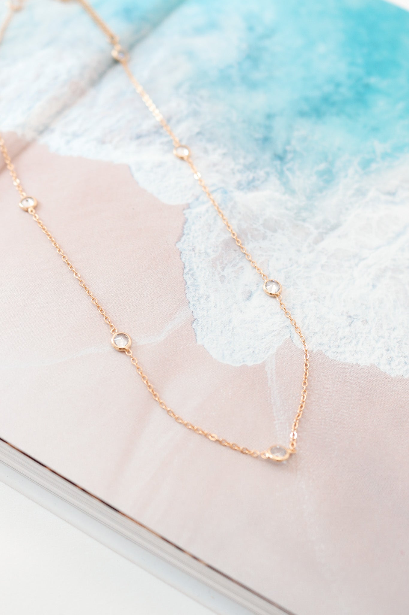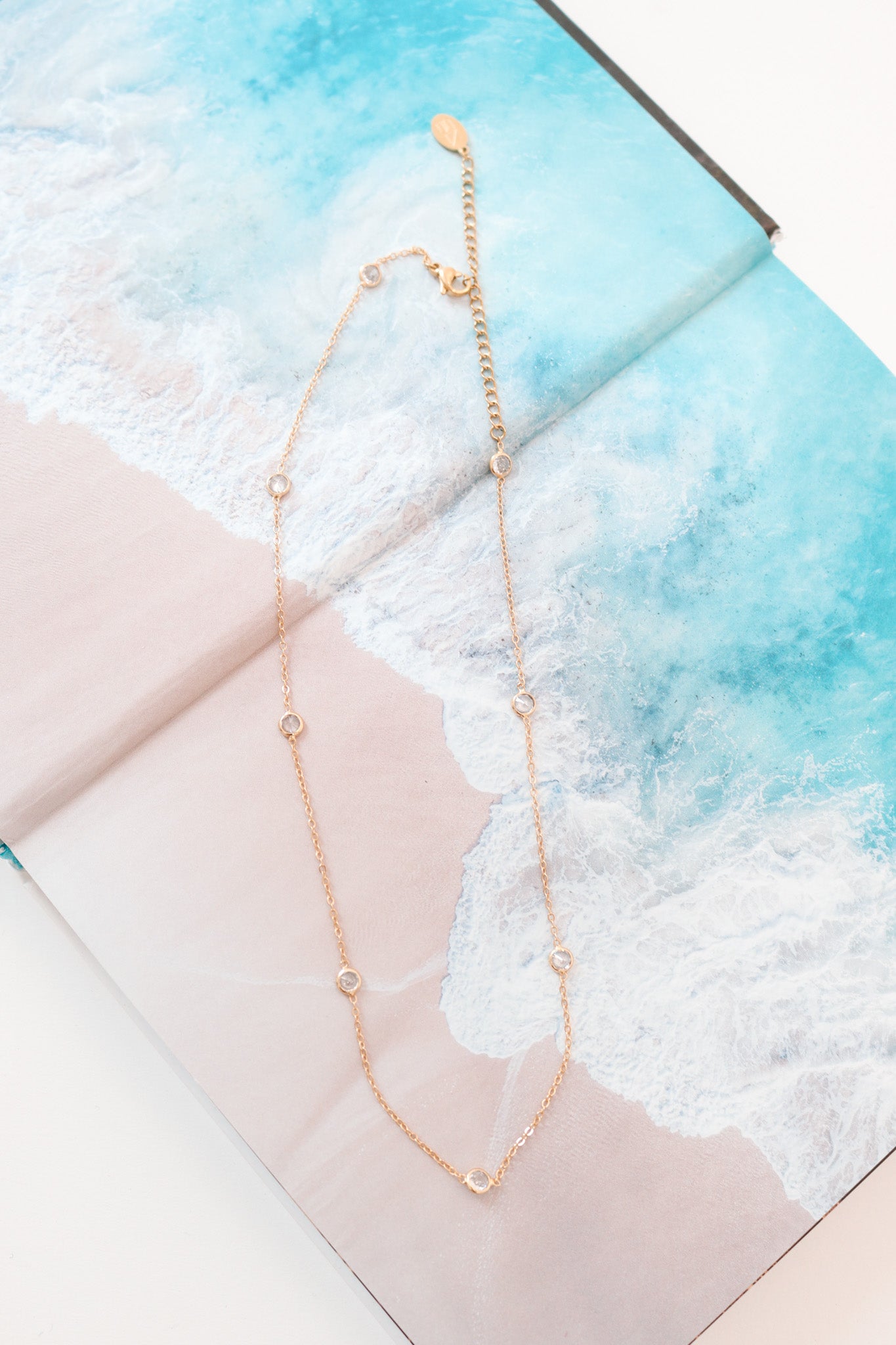 Delicate yet dazzling, this gold dainty necklace is sprinkled with tiny crystals that catch the light with every move. Its elegant simplicity makes it perfect for layering or shining solo as a subtle statement. Whether you're dressing up or keeping it casual, this little beauty adds just the right touch of sparkle!