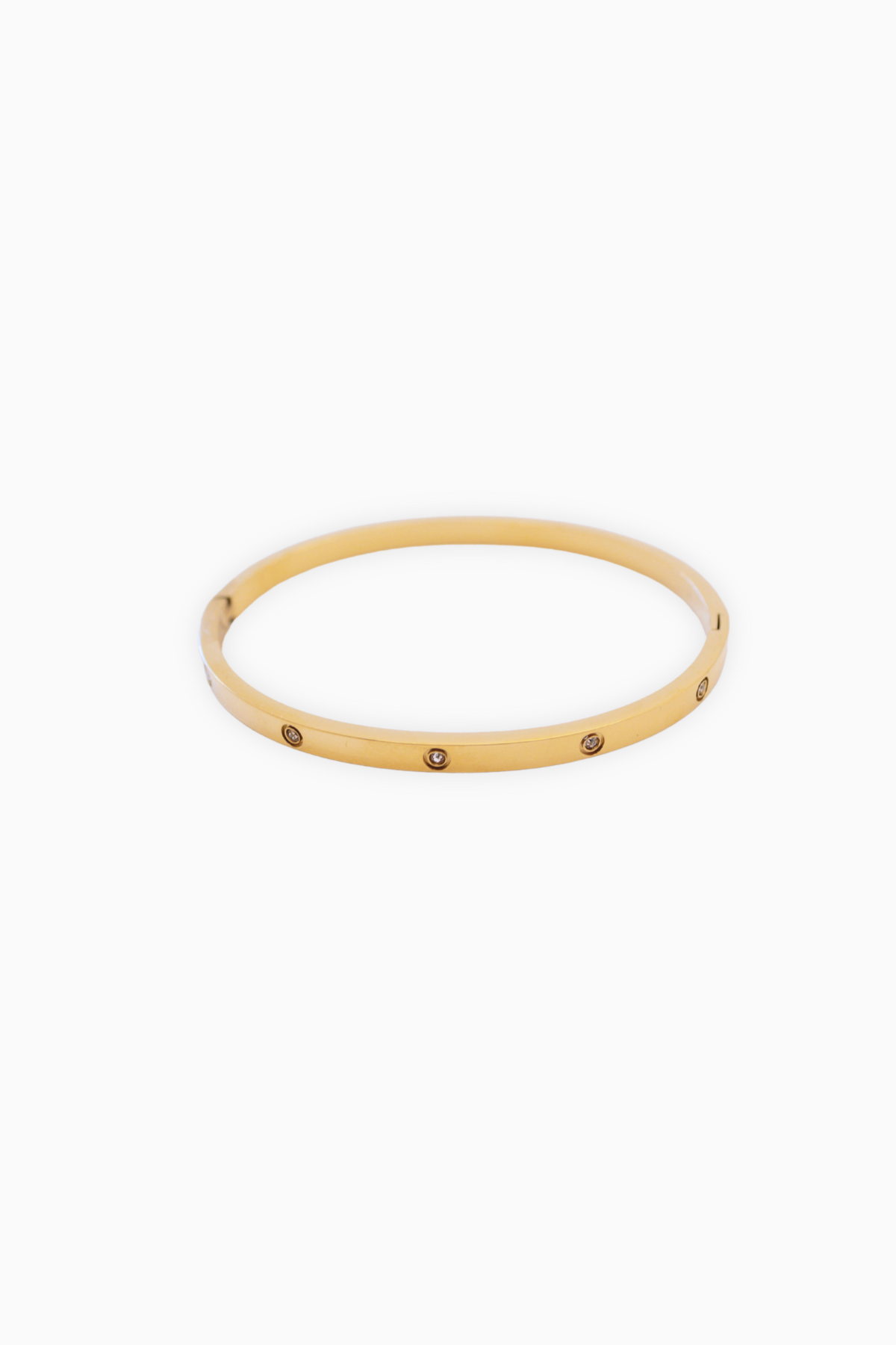 Slip on a touch of sparkle with this gold bangle, delicately sprinkled with tiny stones for just the right amount of shimmer! Effortlessly elegant yet endlessly versatile, it’s the perfect piece to stack or wear solo for a subtle statement. Whether you're brunching, dazzling at dinner, or simply elevating your everyday, this bangle brings the glow wherever you go!