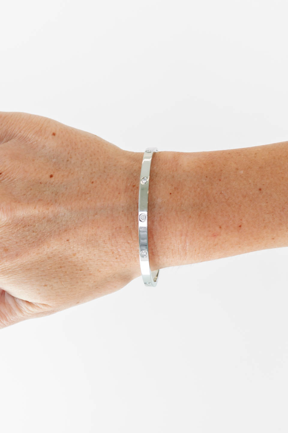 Slip on a touch of sparkle with this silver bangle, delicately sprinkled with tiny stones for just the right amount of shimmer! Effortlessly elegant yet endlessly versatile, it’s the perfect piece to stack or wear solo for a subtle statement. Whether you're brunching, dazzling at dinner, or simply elevating your everyday, this bangle brings the glow wherever you go!