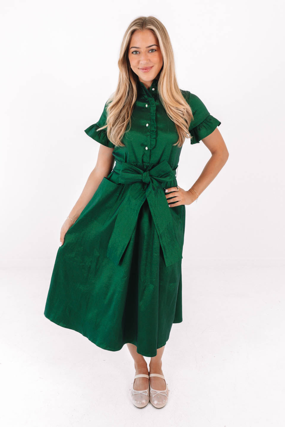 The Hazel Belted Button Up Midi Dress - Hunter Green