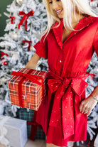 Add a polished touch to your wardrobe with this red dress featuring elegant pearl accents and two front pockets. The button-up neckline and sleek silhouette create a chic, refined vibe - perfect for special occasions or stylish family photos. Pair with your favorite tights and heels for a complete, holiday look!