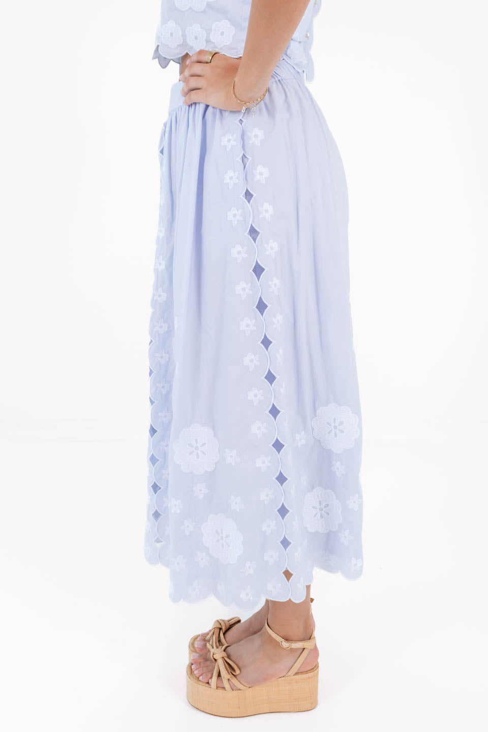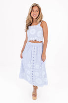 This elegant midi skirt features a soft periwinkle hue with delicate embroidered detailing for a romantic, elevated feel. Designed with a flattering, flowy silhouette that moves beautifully with every step, it’s both timeless & versatile—perfect for pairing with our Ember Top for garden parties, brunch dates, or any spring celebration.
