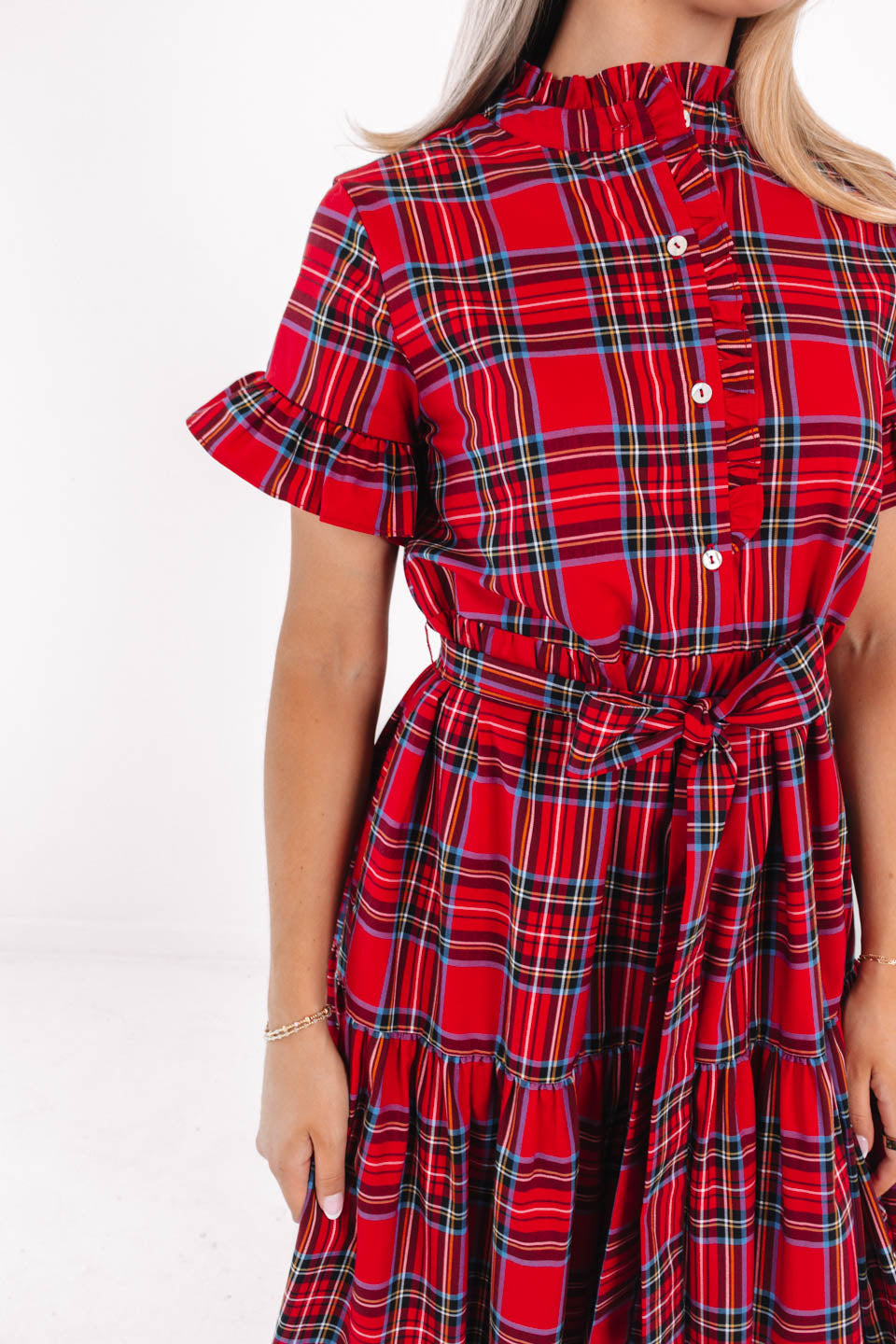 Bring holiday cheer to your wardrobe with this red plaid midi dress, featuring a classic button-up neckline and an adjustable tie belt. The cheerful print and flattering silhouette bring a joyful, seasonal charm - perfect for holiday gatherings. Pair with your favorite heels for the perfect holiday look!