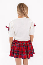 Bring cozy holiday charm to your wardrobe with this white fitted sweater adorned with sweet red plaid bows. Its puff sleeves and darling details add a touch of whimsy - perfect for warmer days and cheerful holiday outings. Pair with our Hollin Skort for the perfect holiday look!