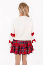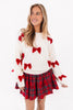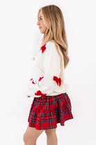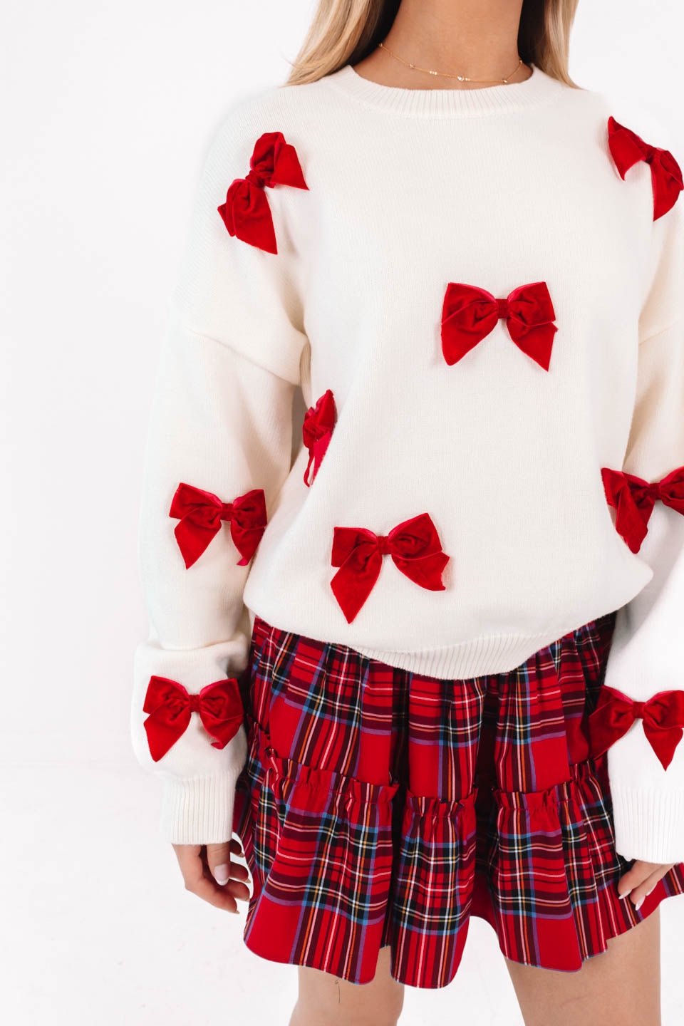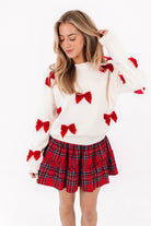 Bring cozy holiday charm to your wardrobe with this white oversized sweater adorned with sweet red bows. Its relaxed fit and darling details add a touch of whimsy - perfect for snowy mornings and cheerful holiday outings. Pair with our Hollin Skort for the perfect holiday look!