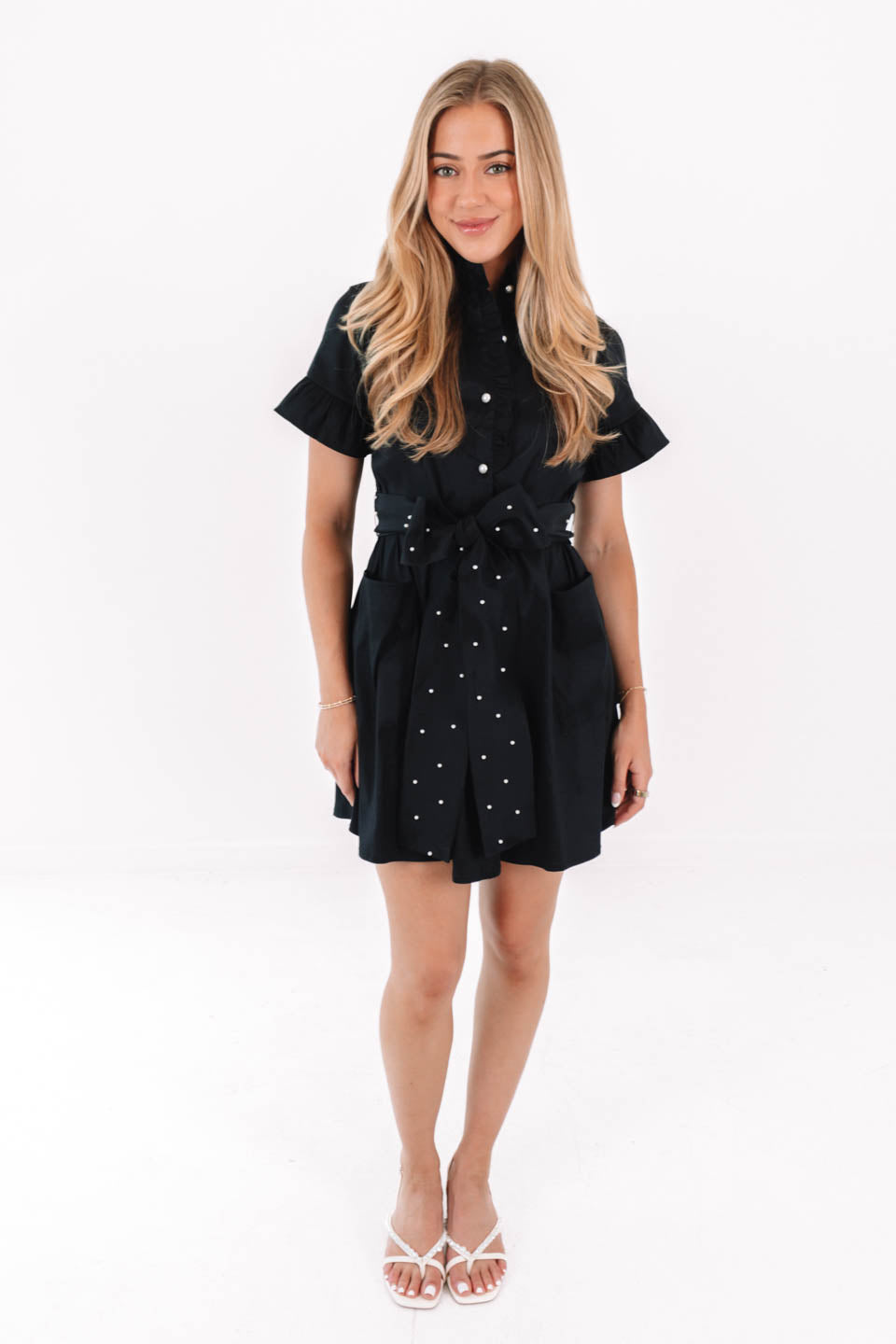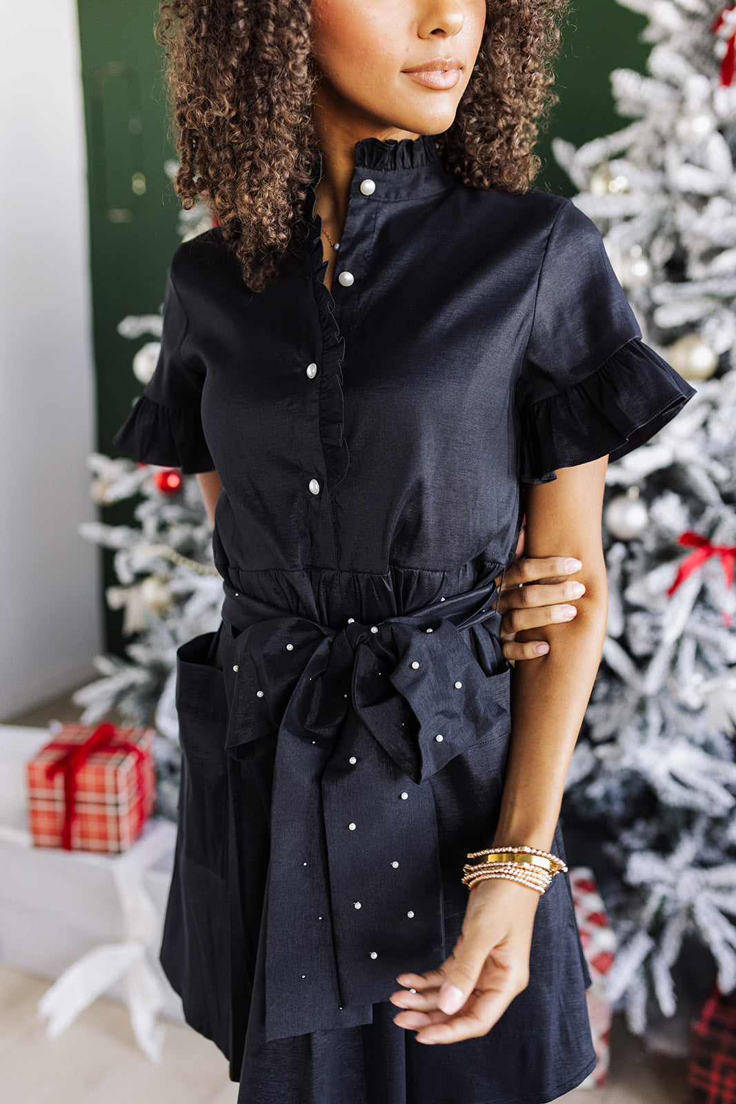Add a polished touch to your wardrobe with this black dress featuring elegant pearl accents and two front pockets. The button-up neckline and sleek silhouette create a chic, refined vibe - perfect for special occasions or stylish family photos. Pair with your favorite tights and heels for a complete, holiday look!