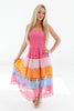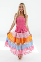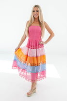This strapless midi dress is a total showstopper with its playful rainbow tiers and dreamy eyelet texture. Flirty, feminine, and full of personality, it’s made for twirling through brunch dates, garden parties, and sunny celebrations. Add heels or sandals and let the color do the smiling for you!