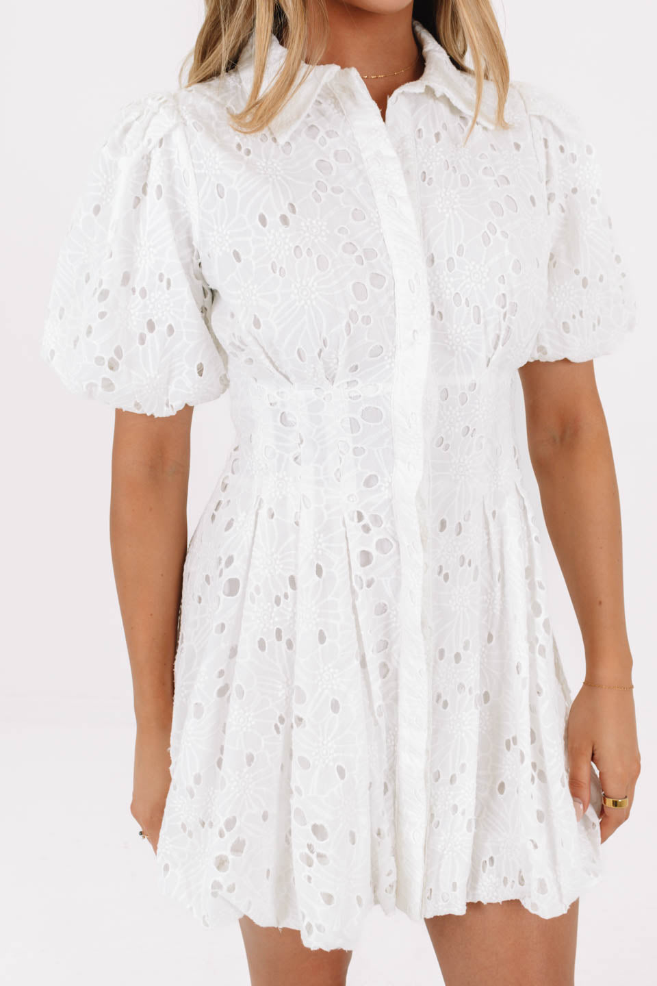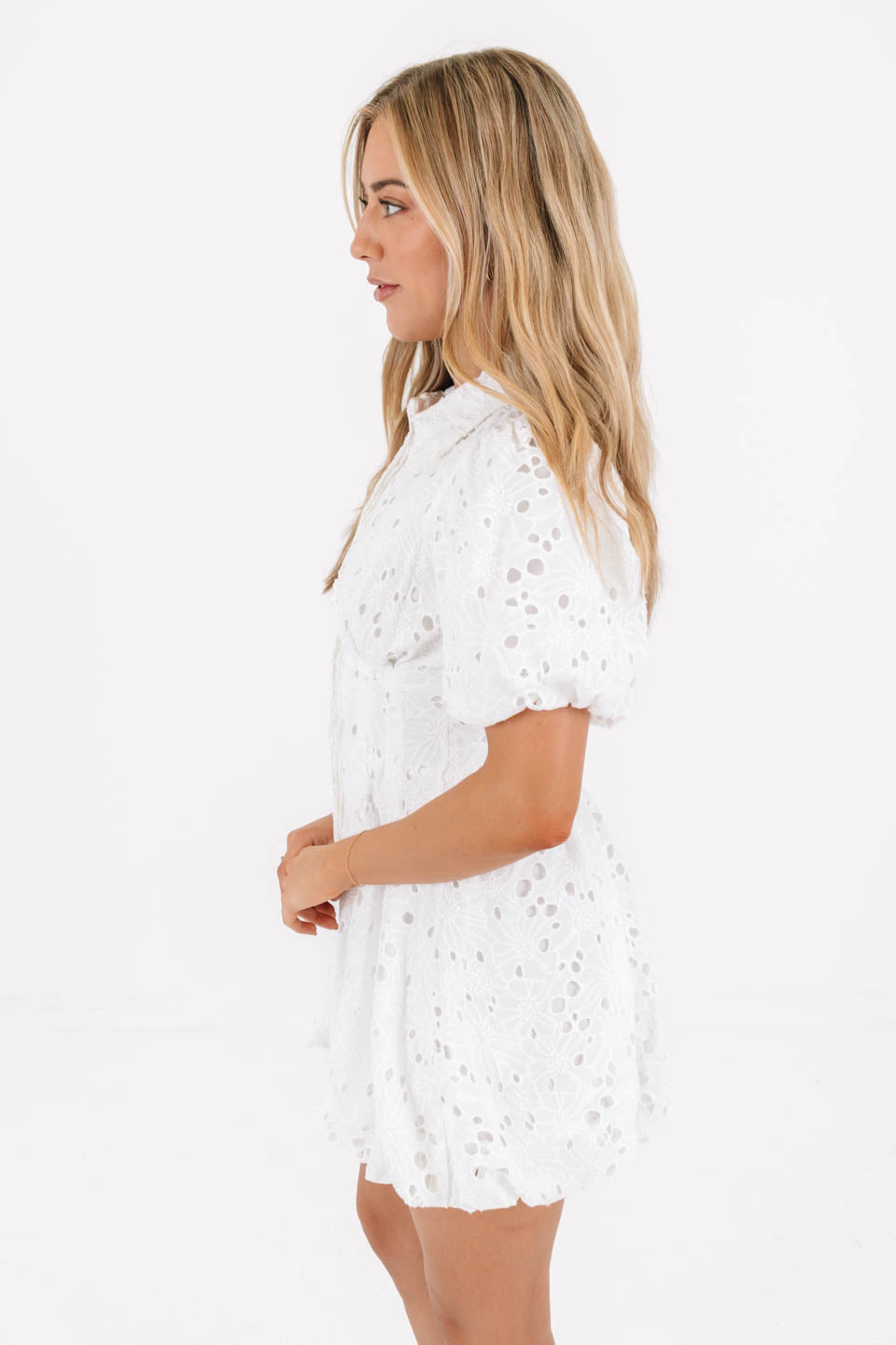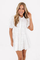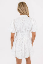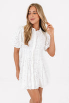 Sweet, airy, and effortlessly chic, this white eyelet mini dress is the definition of timeless charm. The delicate cutout embroidery, puff sleeves, and fitted waist create a flattering silhouette that feels both feminine and fresh. Perfect for brunch, bridal events, or sunny days when you want to look instantly polished.