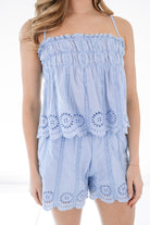 Light, airy, and effortlessly pretty, this blue embroidered top is made for warm, easy days. Delicate eyelet details and soft ruching give it a feminine touch, while the relaxed fit keeps it comfortable and breezy. It’s the kind of top that looks polished without trying too hard.