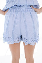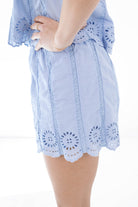 These matching blue eyelet shorts are the definition of cute and carefree. The scalloped hem and intricate embroidery add just the right amount of detail, while the flowy fit keeps things easy and wearable. Perfect for pairing with the top or styling solo for a laid-back, sunny look.