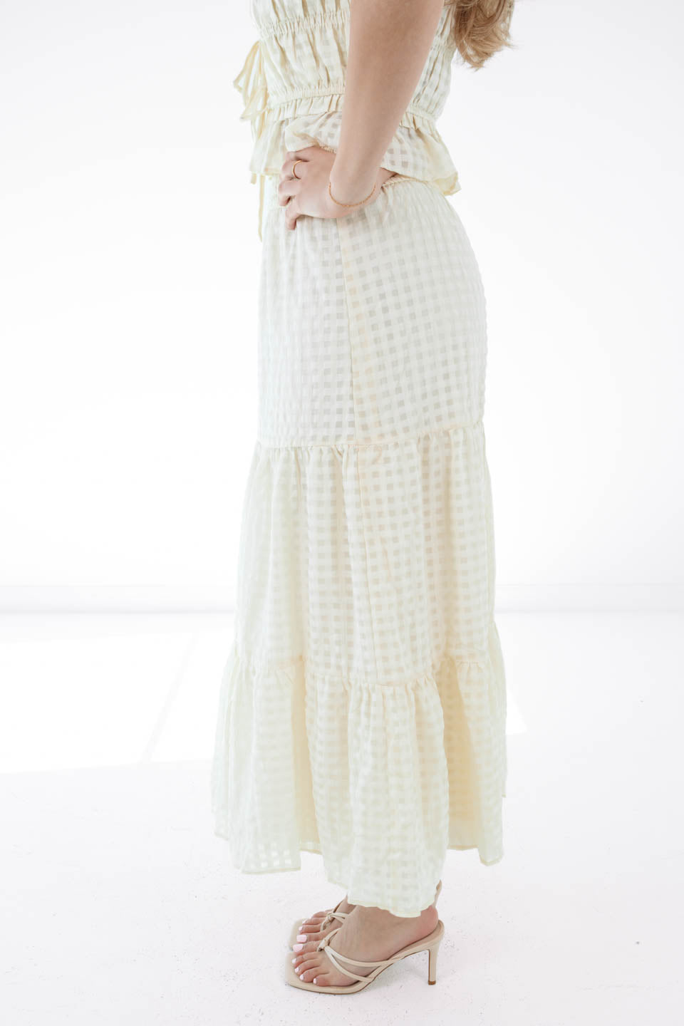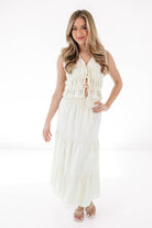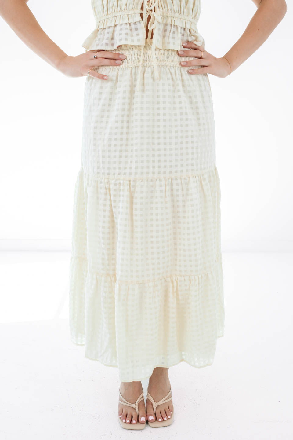 Twirl into your picnic era with this tiered monochrome maxi skirt that’s equal parts sweet and statement. The flowy silhouette was made for catching breezes and compliments alike. Whether you're brunch-bound or backyard party-ready, this skirt brings the charm.