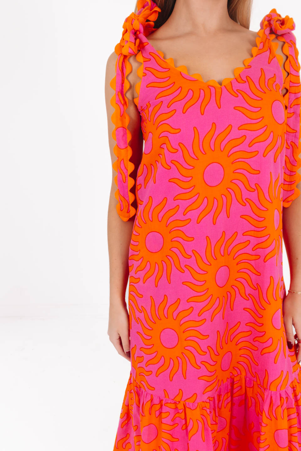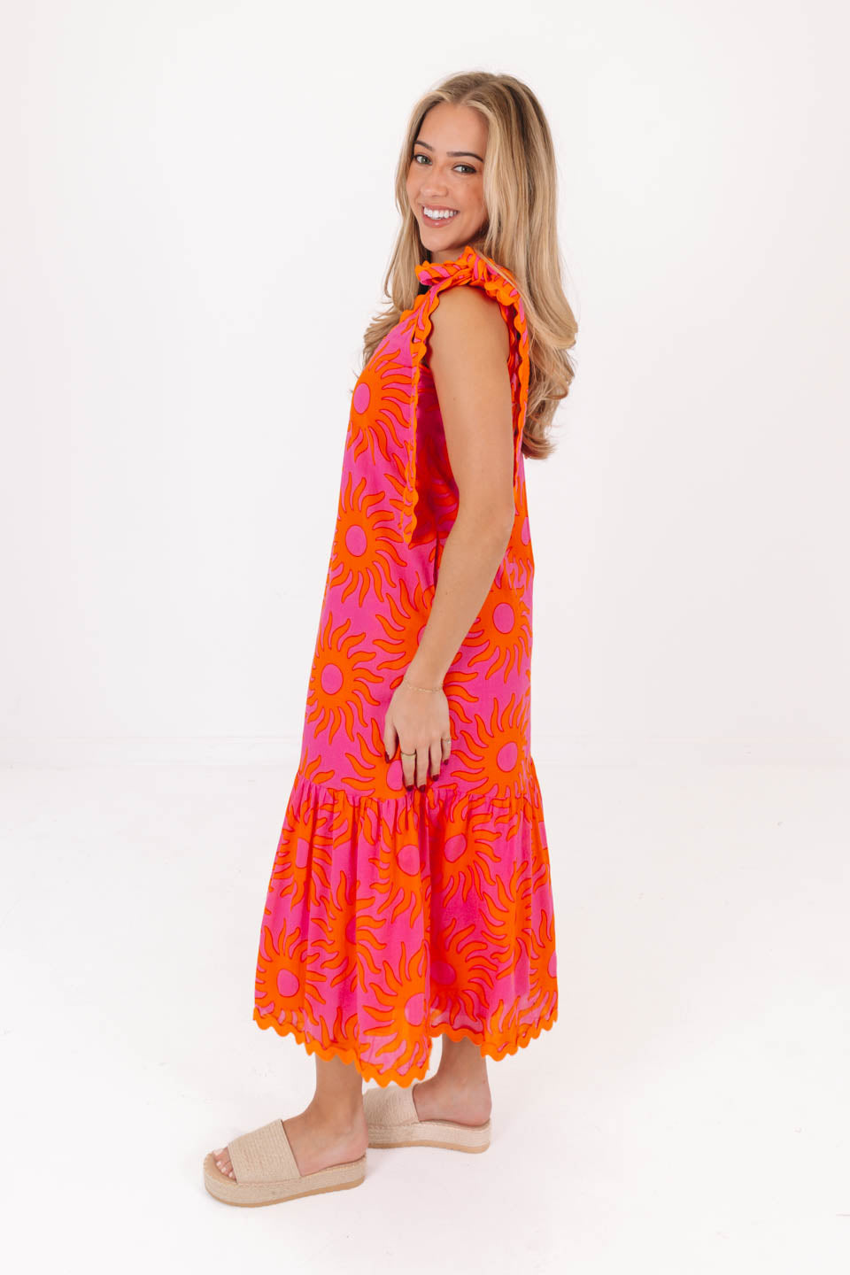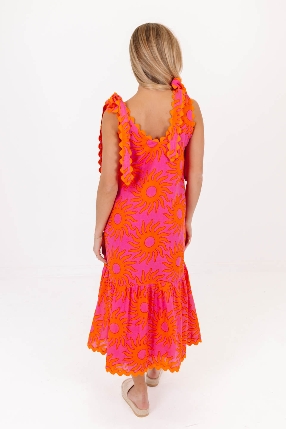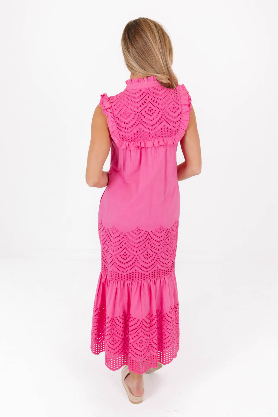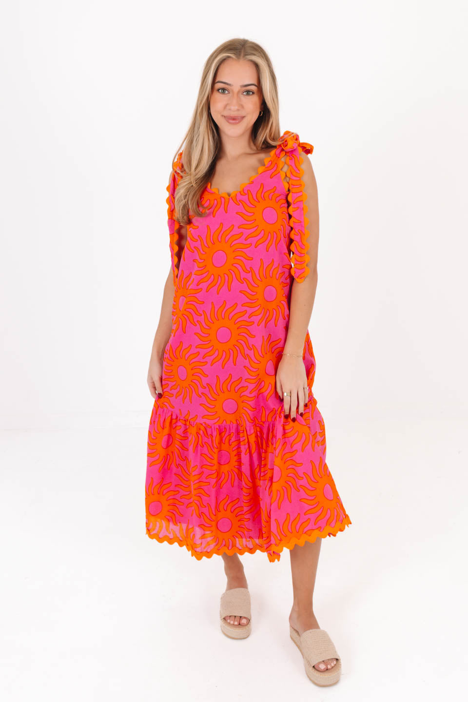 The Mara Ric Rac Tie Strap Midi Dress - Hot Pink
