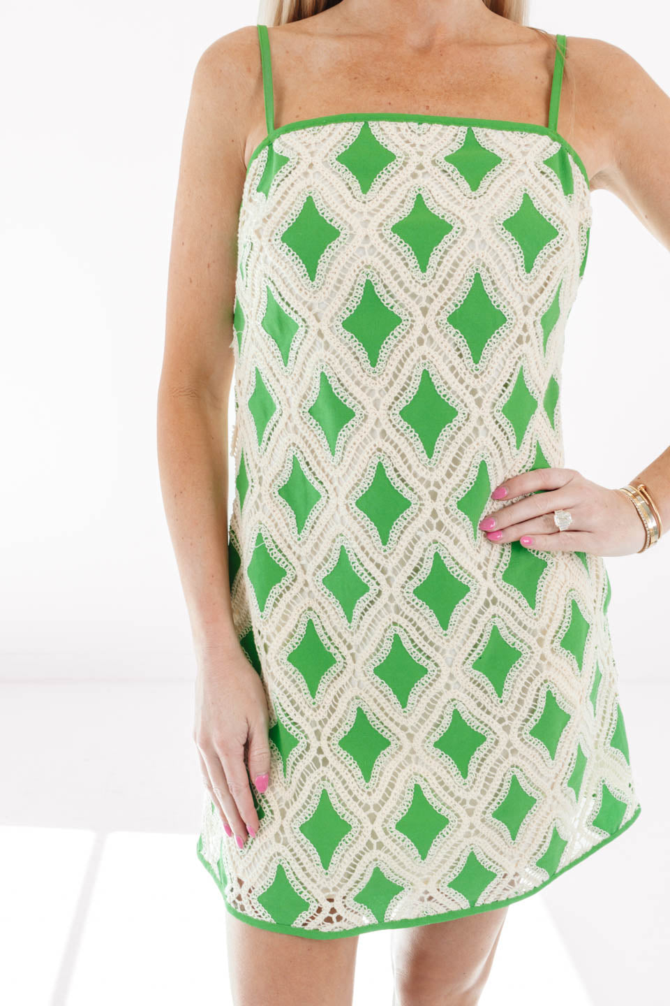 This playful green mini dress pops with an eye-catching geometric pattern that feels retro-chic and totally fresh. The slim straps and easy silhouette make it perfect for warm days, iced coffees, and spontaneous plans. Just add sandals and sunnies and let this dress do all the talking.