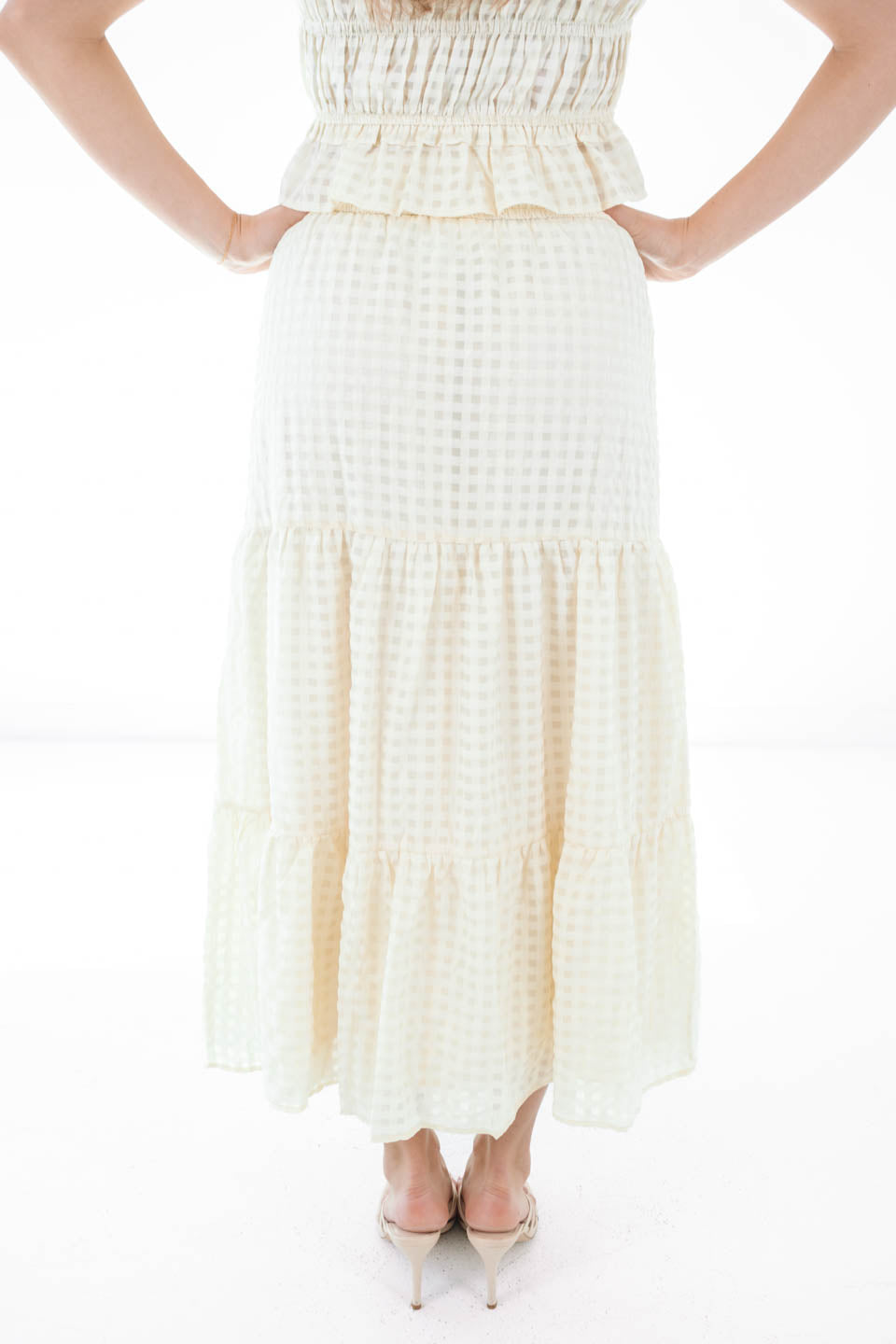 Twirl into your picnic era with this tiered monochrome maxi skirt that’s equal parts sweet and statement. The flowy silhouette was made for catching breezes and compliments alike. Whether you're brunch-bound or backyard party-ready, this skirt brings the charm.