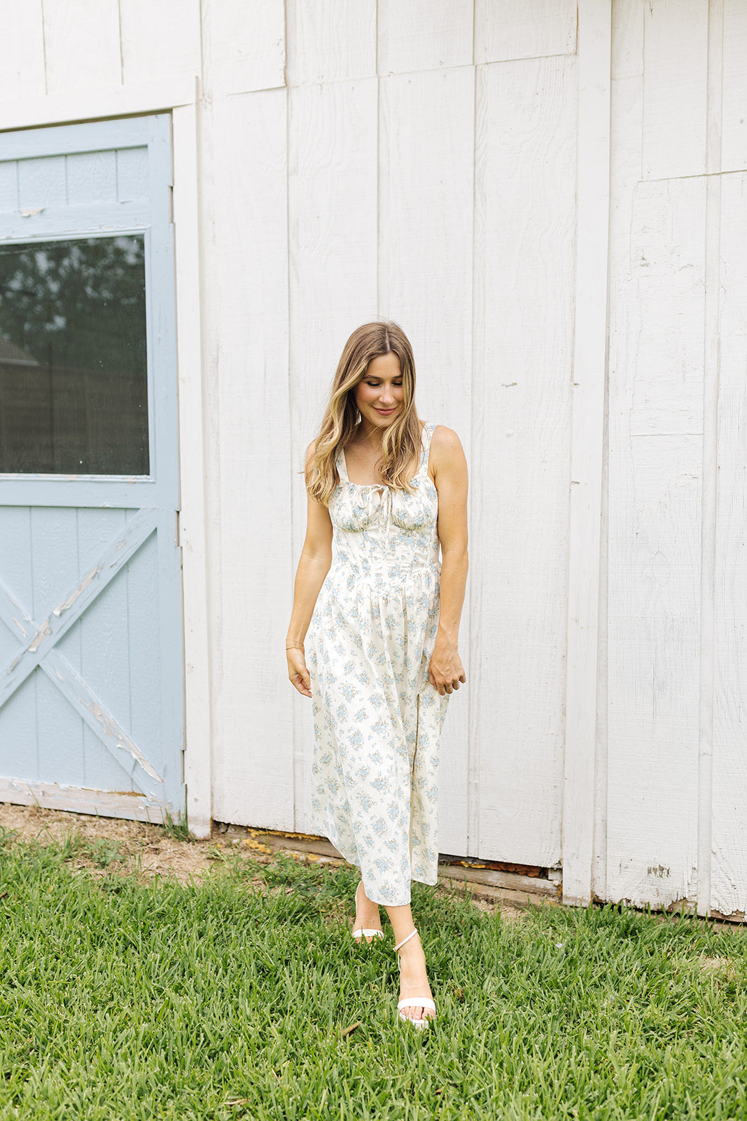 This effortlessly elegant midi dress is your new go-to for garden parties and dreamy summer strolls. With its delicate floral print, ruched bodice, and a leg-baring side slit, it’s equal parts sweet and subtly sexy. Just add sunshine and a glass of rosé, and you're golden!