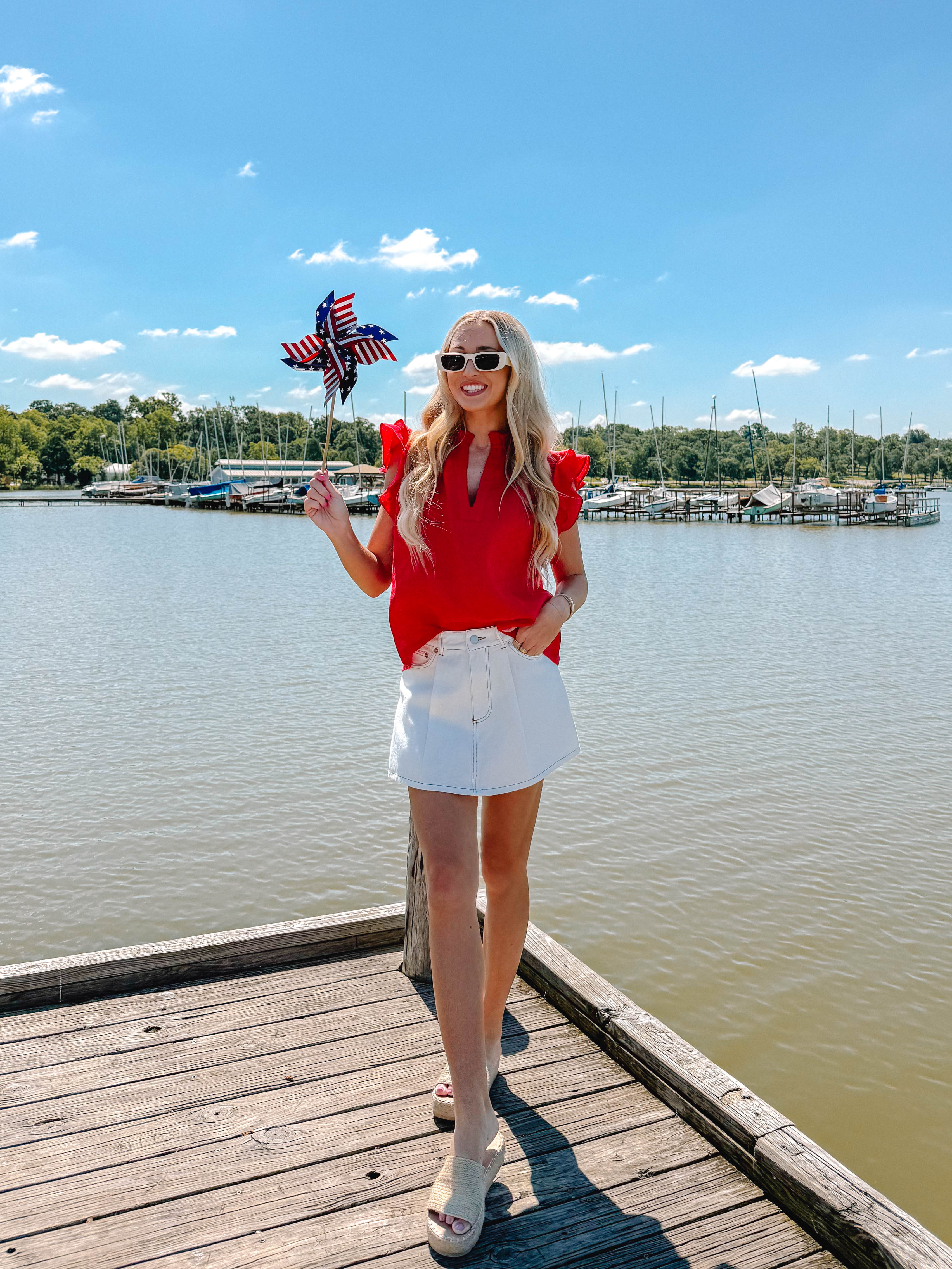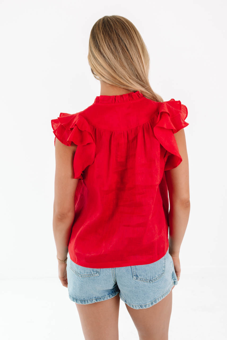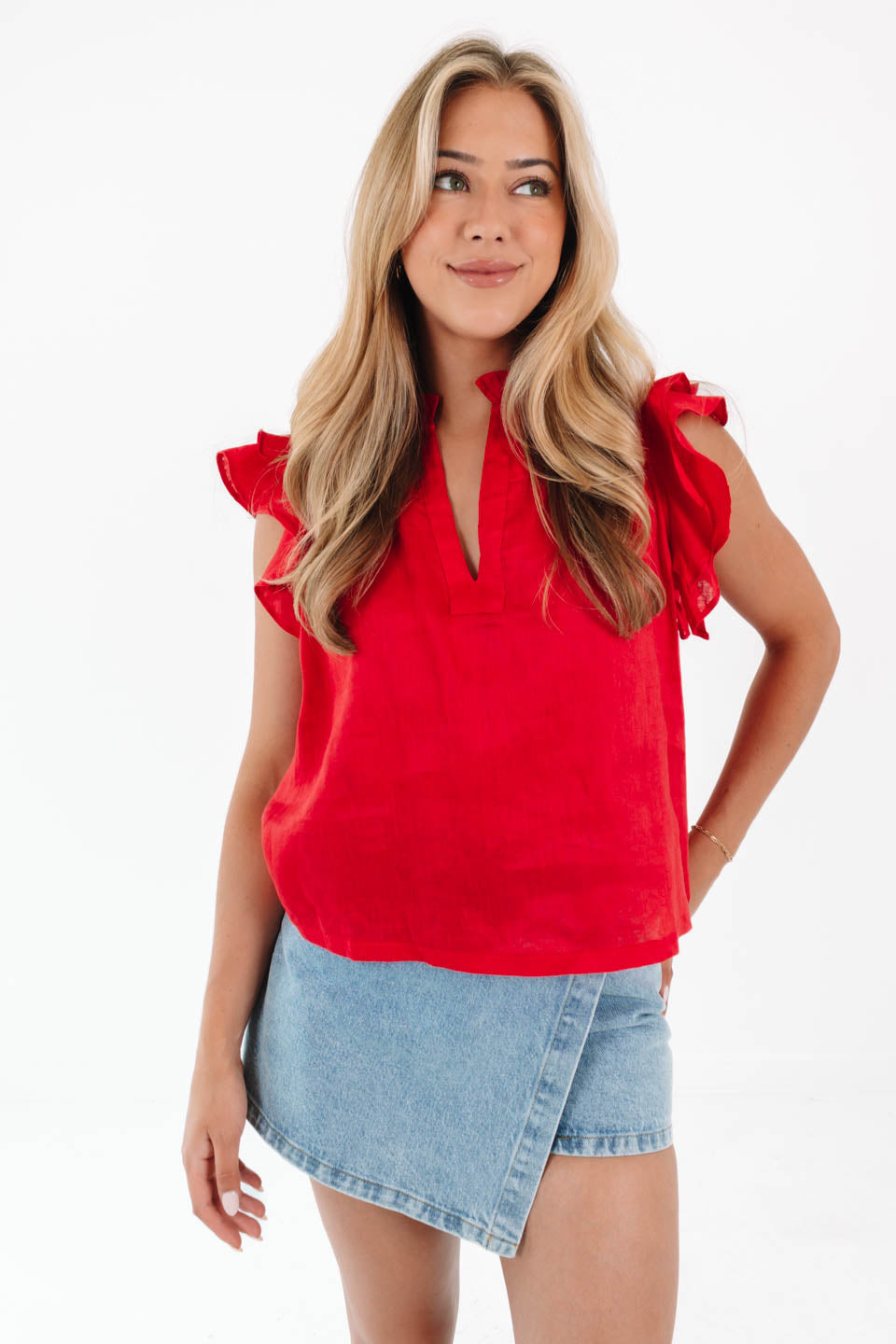 This red top brings the sunshine with fluttery ruffle sleeves and a playful notched neckline that’s all about effortless charm. It’s got just the right mix of sweet and sassy, perfect for brunch dates or breezy strolls. Pair it with denim and gold hoops for instant cool-girl vibes!