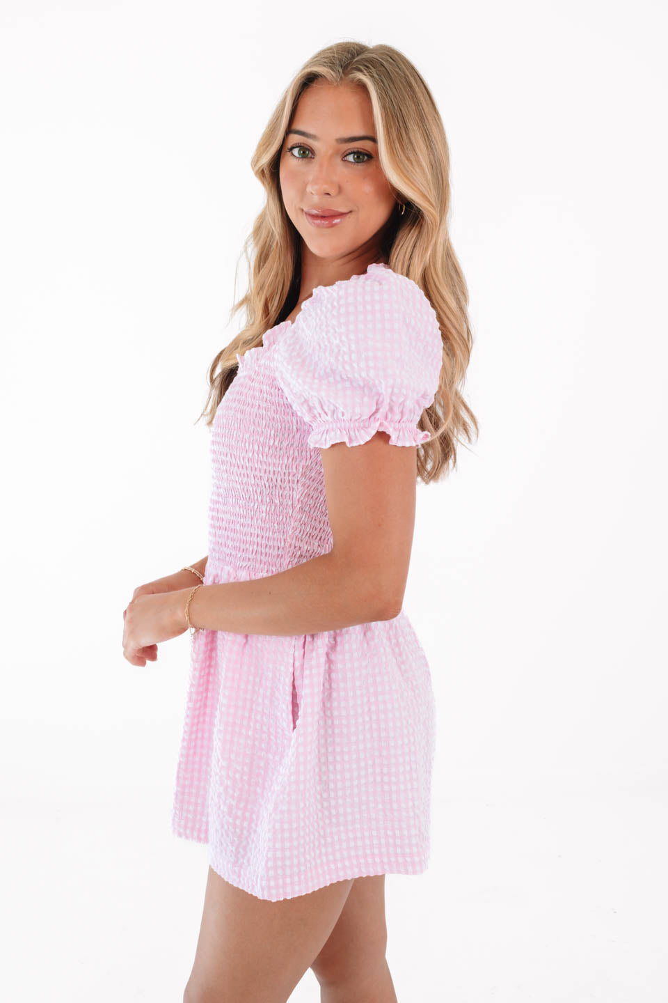 This pink gingham romper is a sweet slice of summertime joy! With its smocked bodice, puff sleeves, and playful fit, it’s made for twirling through picnics or brunch dates. Just add sunshine and your favorite sandals for instant cuteness overload.