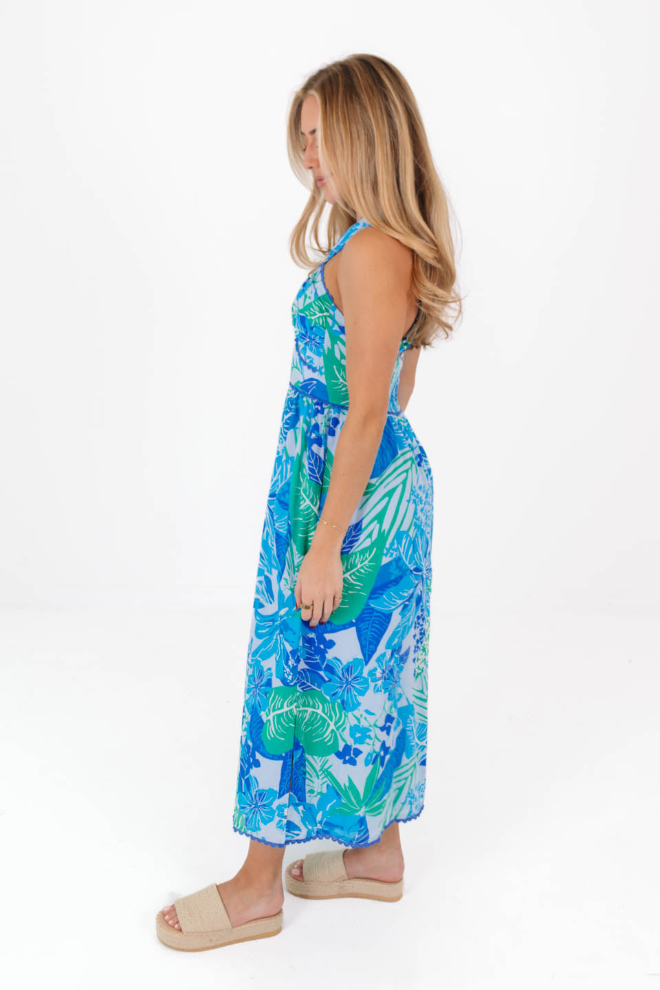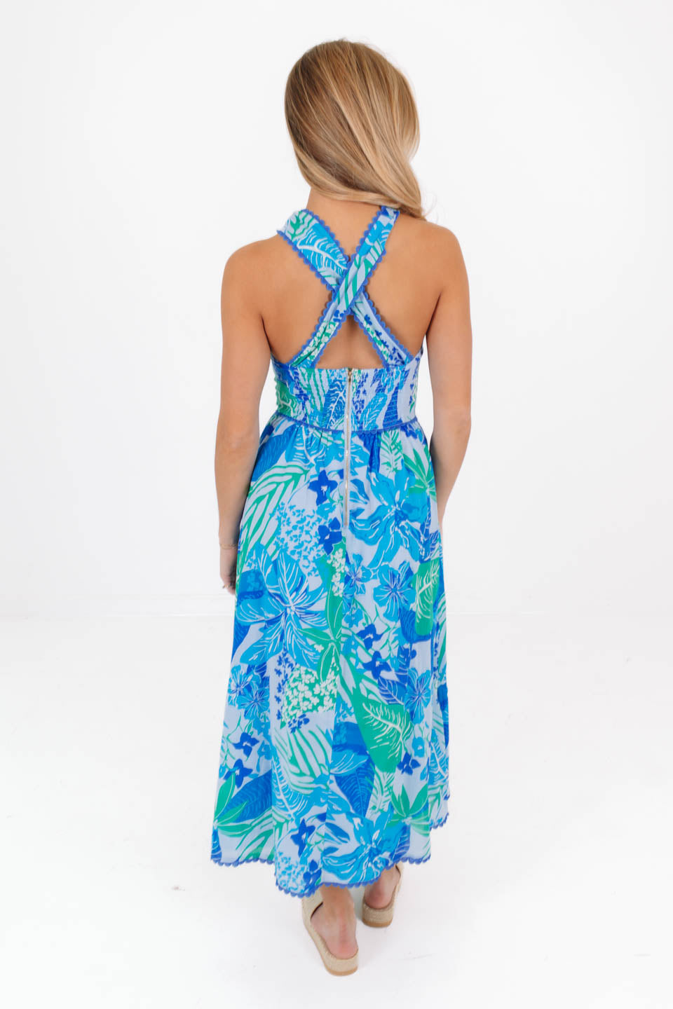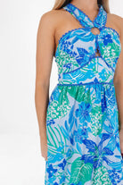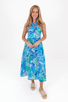 This playful midi dress features a tropical blue print, bringing a fresh and flirty feel to your wardrobe. With ric rac detail adding a playful touch, front cross straps create a flattering sun-kissed look, while the back zipper ensures a sleek fit. Perfect for a spring outing or special occasion, this dress combines style and comfort effortlessly.