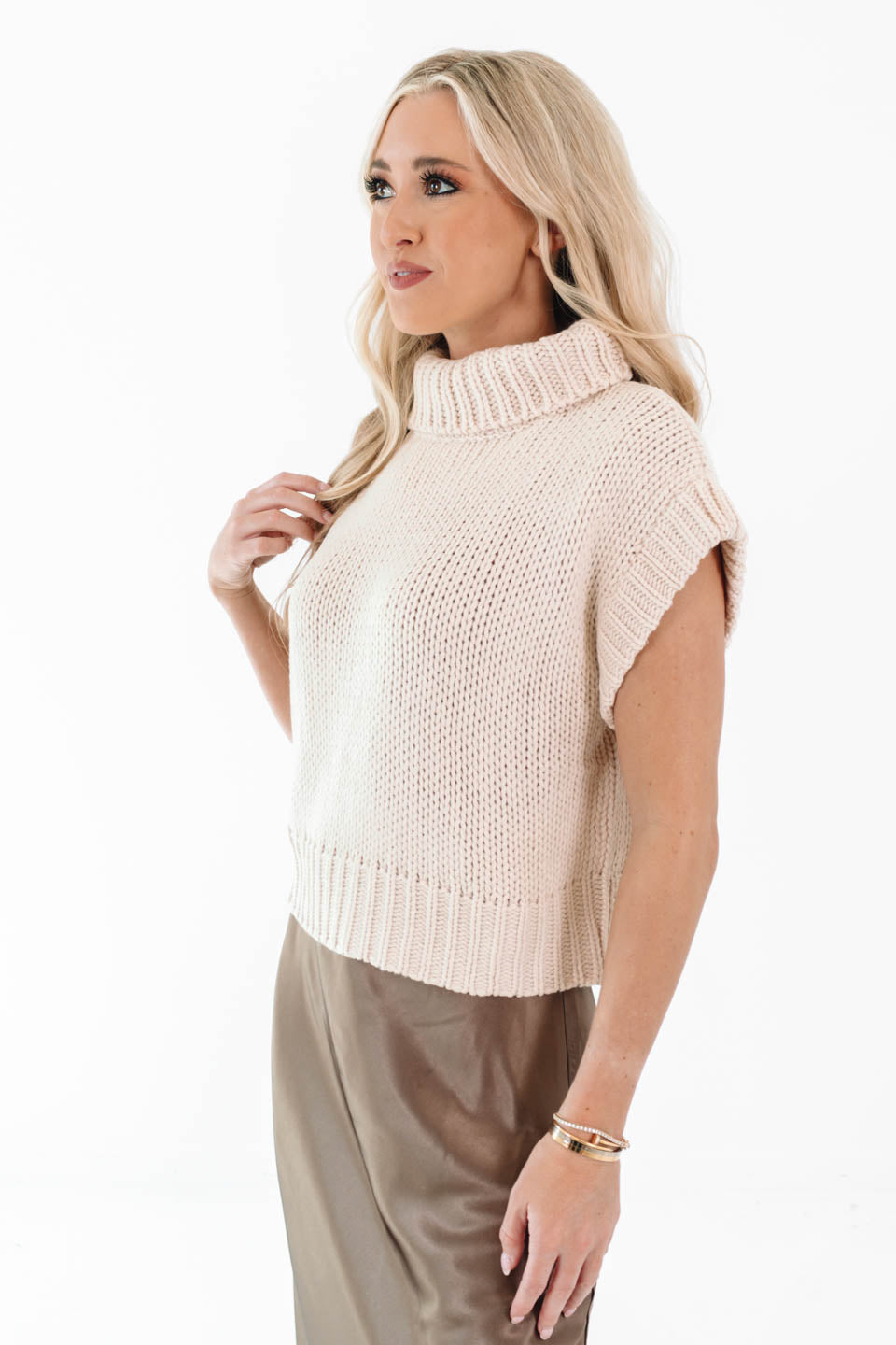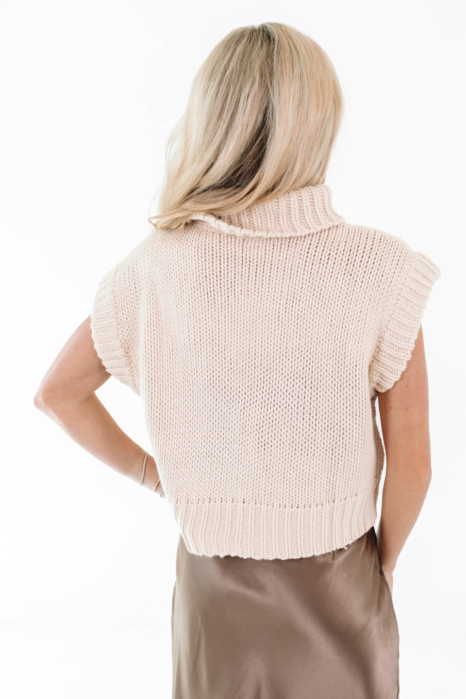 Cozy meets chic in this sleeveless knit sweater with its chunky turtleneck and relaxed fit. The soft neutral shade makes it endlessly versatile, while the ribbed hem and sleeves give it that perfect polished touch. Pair it with jeans or layer it over a dress for an effortlessly cool vibe!