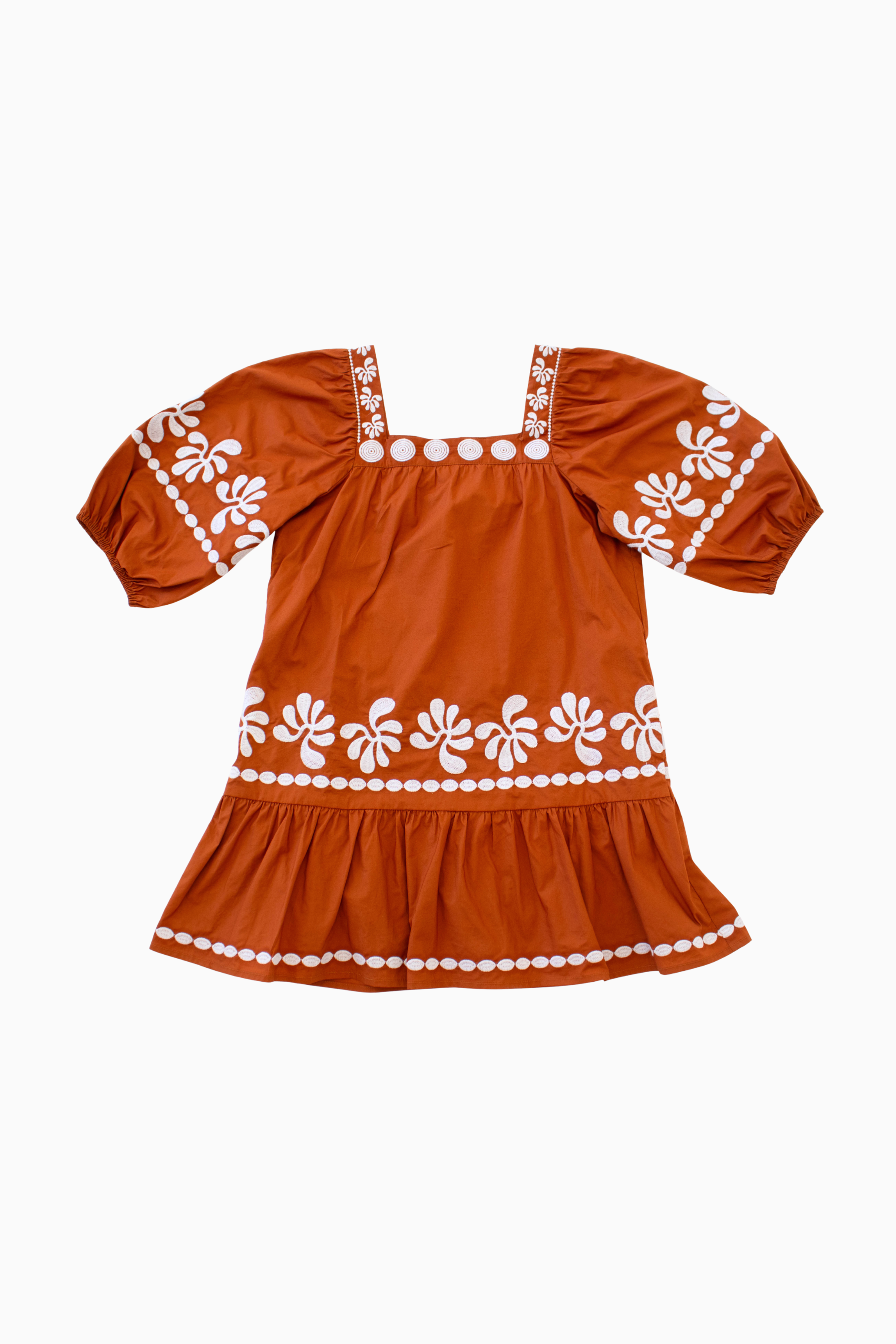 Bold in burnt orange! This tween dress features delicate white embroidery, playful puff sleeves, and a tiered structure made for twirling. A perfect style to match mom’s game day look with effortless fall vibes. Ideal for cheering on your team, weekend outings, and autumn fun!